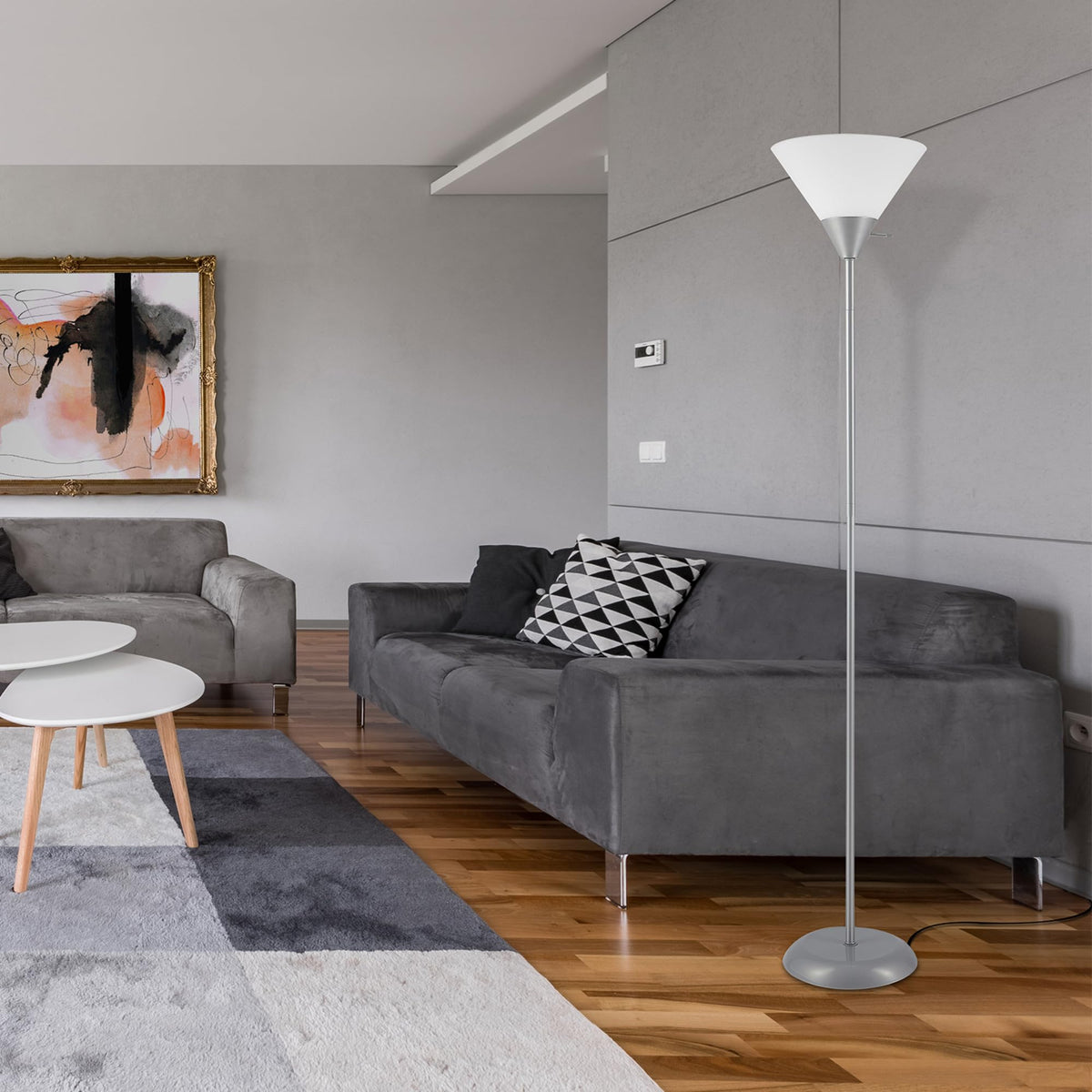 The silver finish and white shade of the Elliott Floor Lamp brings a modern contemporary style to life. Sitting at 72-inches height with a sturdy 10-inch base, Elliott takes up very little floor space but provides a lot of light. The frosted shade ensures a great glow. Perfect for complementing all decor styles, the silver finish adds a modern feel and brings your room to life.