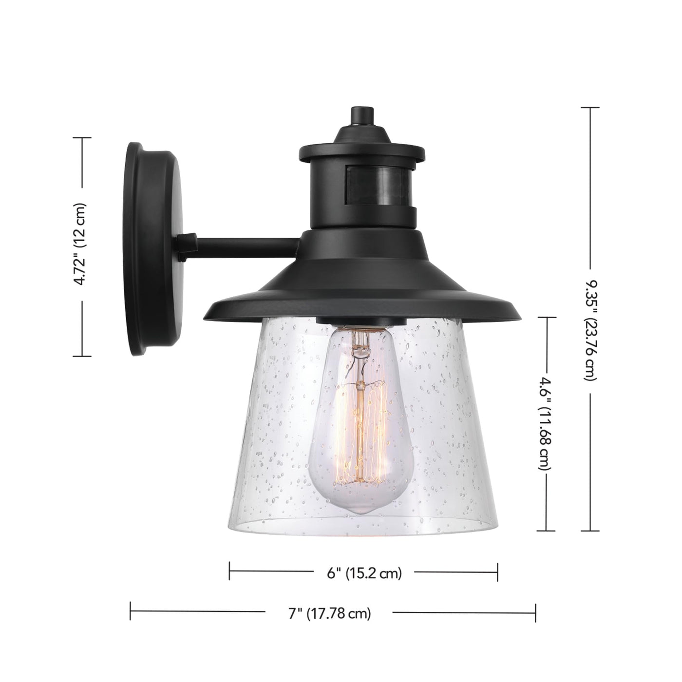 Q: What design style does this wall sconce complement?A: The Globe Electric 1-Light Motion Sensor Wall Sconce features a classic farmhouse design with a matte black finish and a clear seeded glass shade. It can easily complement your existing décor and enhance the stylish aesthetic of your outdoor area.