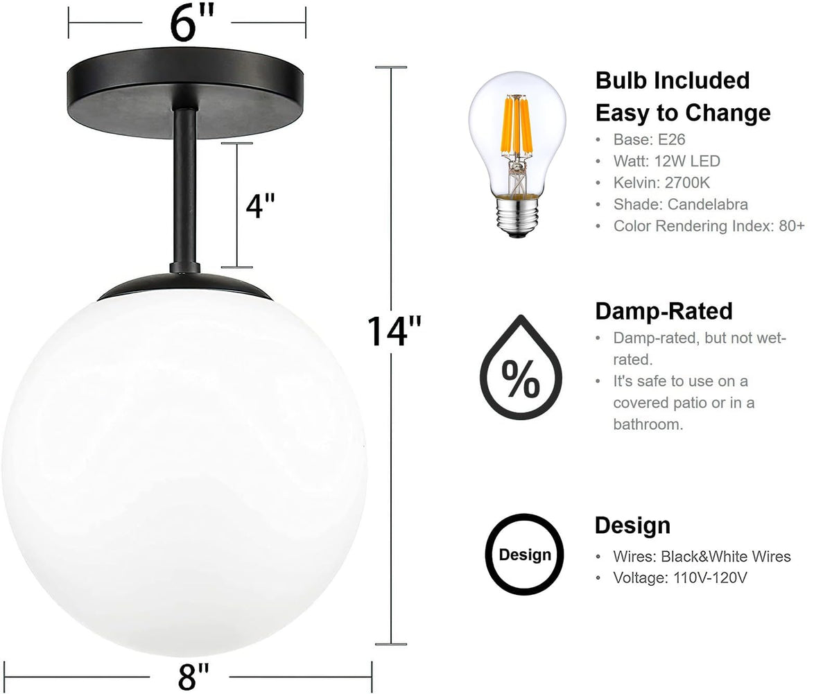 Globe Semi Flush Mount Ceiling Light, Mid Century Modern Light Fixture Ceiling, Milk Glass With Matte Black Finish, Living Room