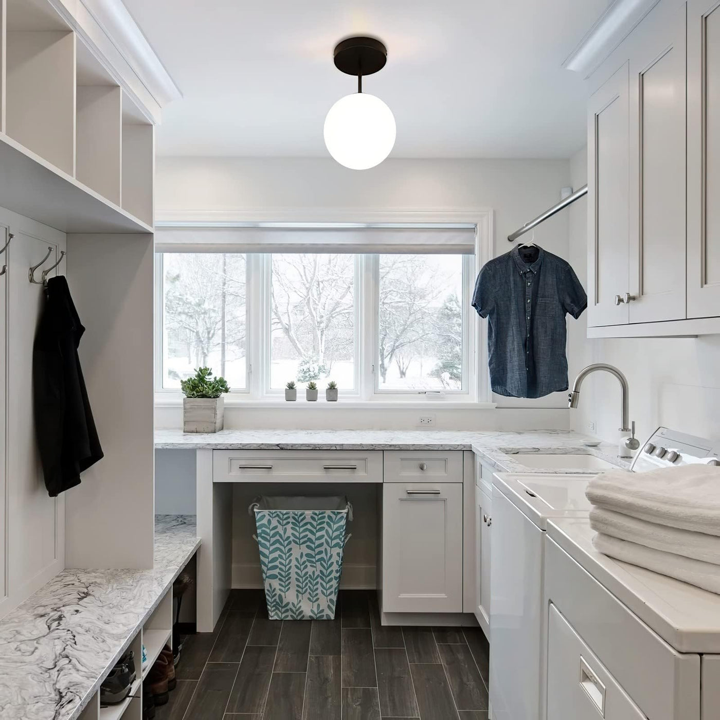 Q: What color finishes are available for this ceiling light?A: This ceiling light features a frosted glass shade paired with a matte black finish, offering a stylish and modern look suitable for various decor styles.