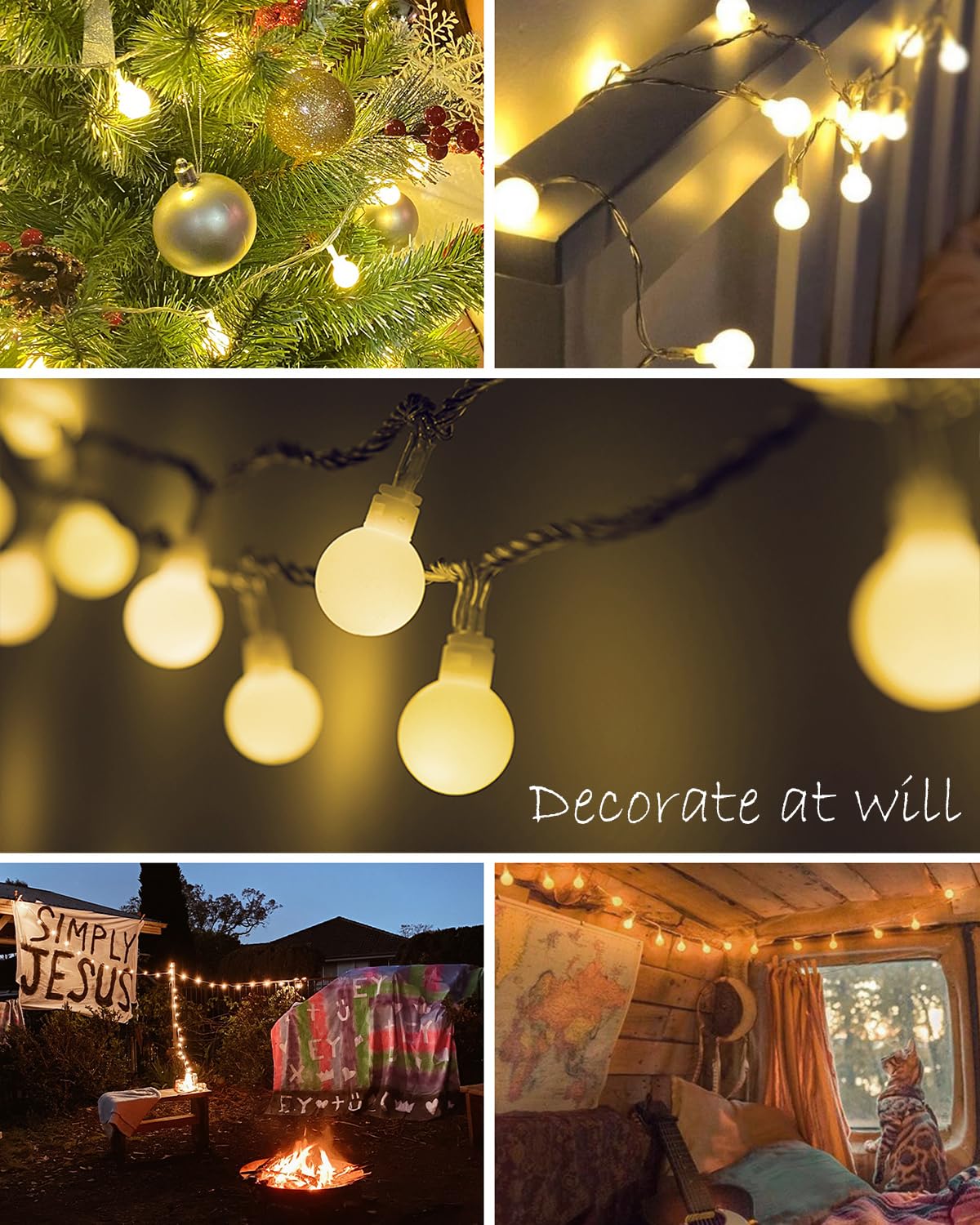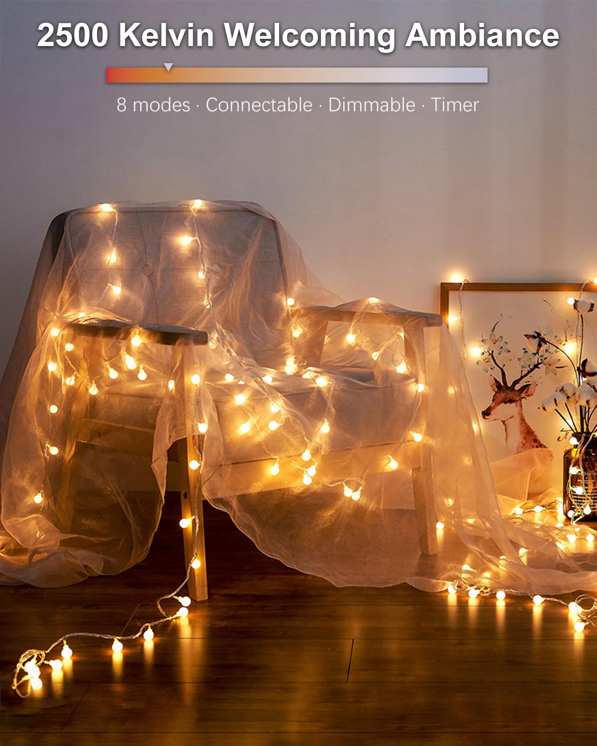 JOLYMOLY globe string lights 59 ft 100 LED fairy lights plug in with remote timer extendable twinkle lights for living room bedroom wedding patio porch Halloween Christmas indoor outdoor decor, warm white Spicing up your home with these cute JOLYMOLY globe string lights. These string lights create a warm and lovely atmosphere. The soft white glow is pretty and adds a real aesthetic to your room or outdoor space. 59 feet is a perfect size and it has 10 feet of leads so you can find a decent plug before you string them along. The 8 different lighting settings are also pretty cool.