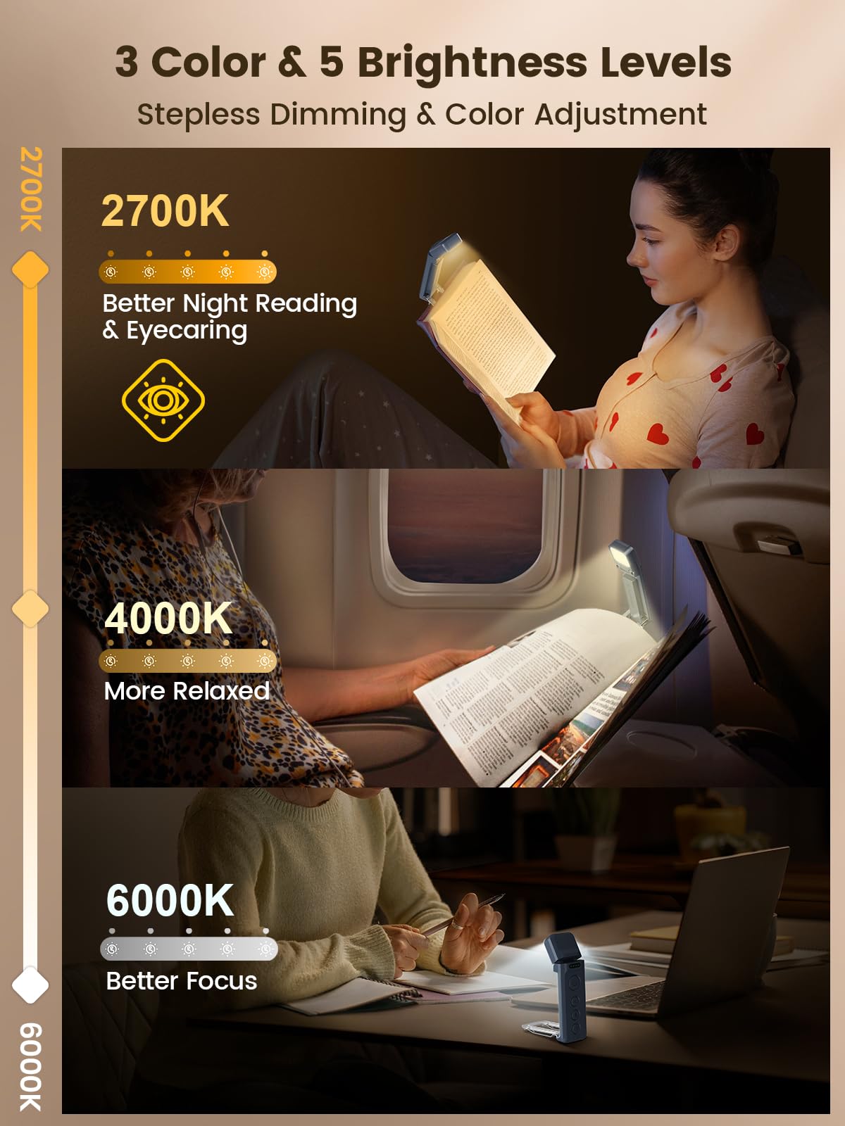 Glocusent Book Light, Reading Light with Sleep Aid & Timer, 5 Brightness & 3-Color Expertise Book Light for Reading in Bed, USB-