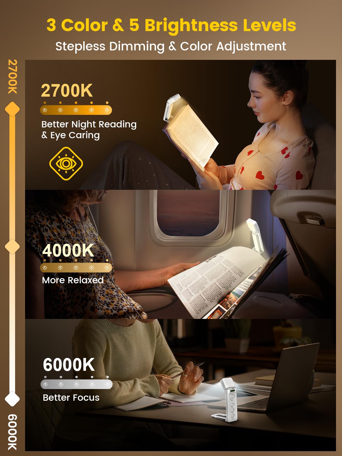 Glocusent Book Lights For Reading At Night, Rechargeable Book Light Clip On - 3 Colors & 5 Brightness, Reading Lights For Books