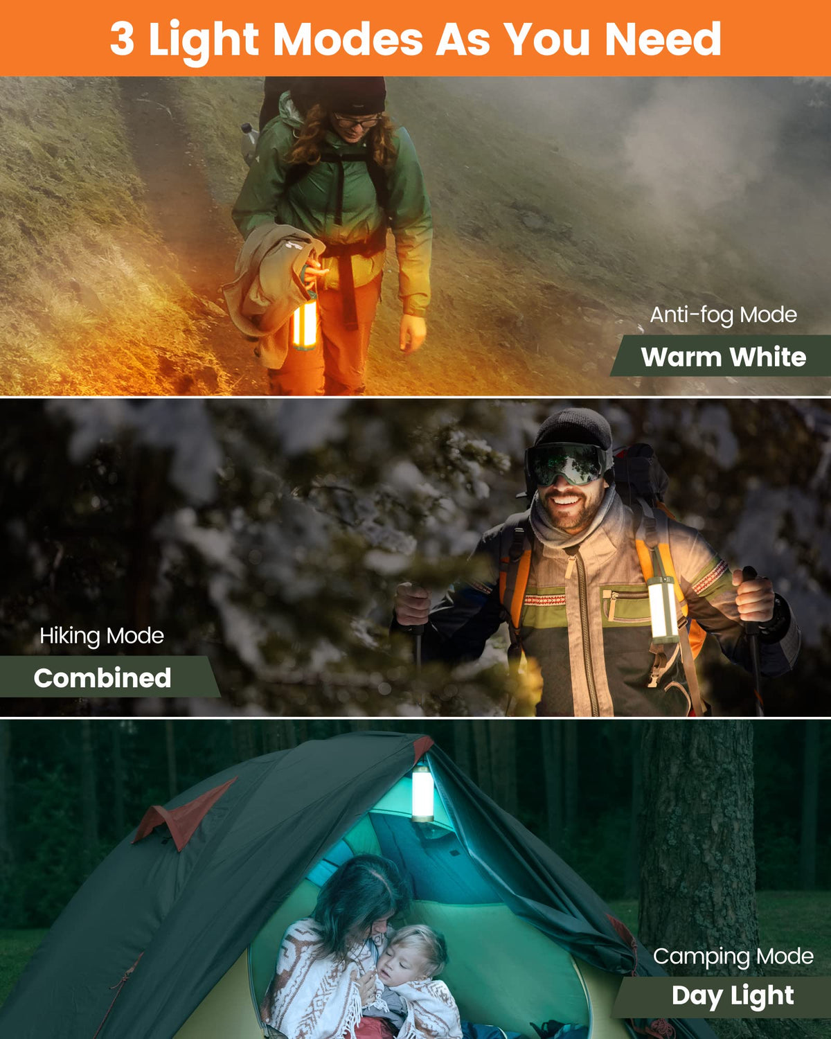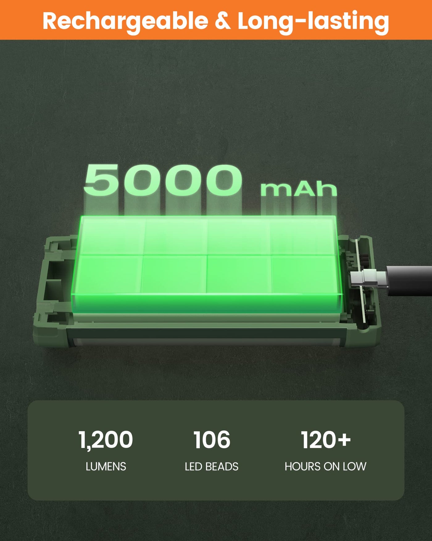 Q: How long does the battery last on a full charge?A: The built-in 5000mAh battery of the Glocusent lantern can last up to 120 hours on a full charge, making it perfect for extended camping trips or in case of power outages.