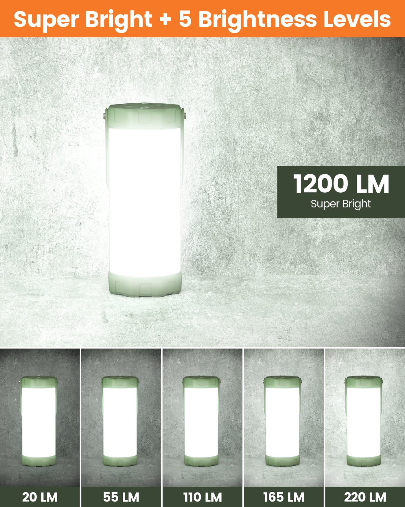 Q: What are the brightness levels of the Glocusent Survival Camping Lantern?A: The Glocusent Survival Camping Lantern features 5 brightness levels, including an ultra bright mode that emits up to 1200 lumens for 3 minutes to illuminate a wider area. The adjustable brightness allows you to customize the light output based on your needs.