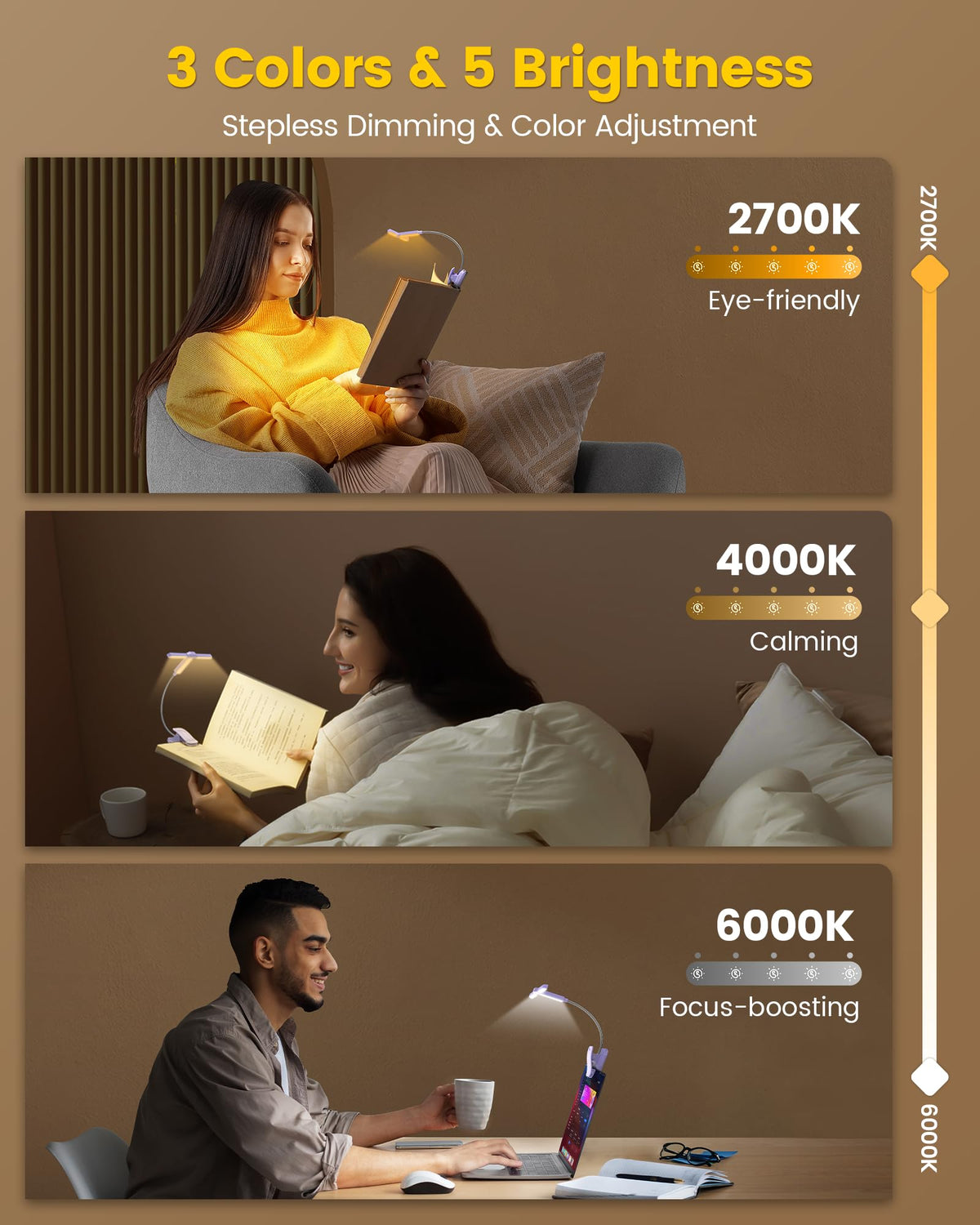 - **Customizable Light Settings**: Choose from 3 color temperatures (2700K, 4000K, and 6000K) and 5 adjustable brightness levels. Whether you prefer a soothing ambiance or a bright spotlight for focused reading, simply long-press the button for seamless selection that enhances your reading experience.
