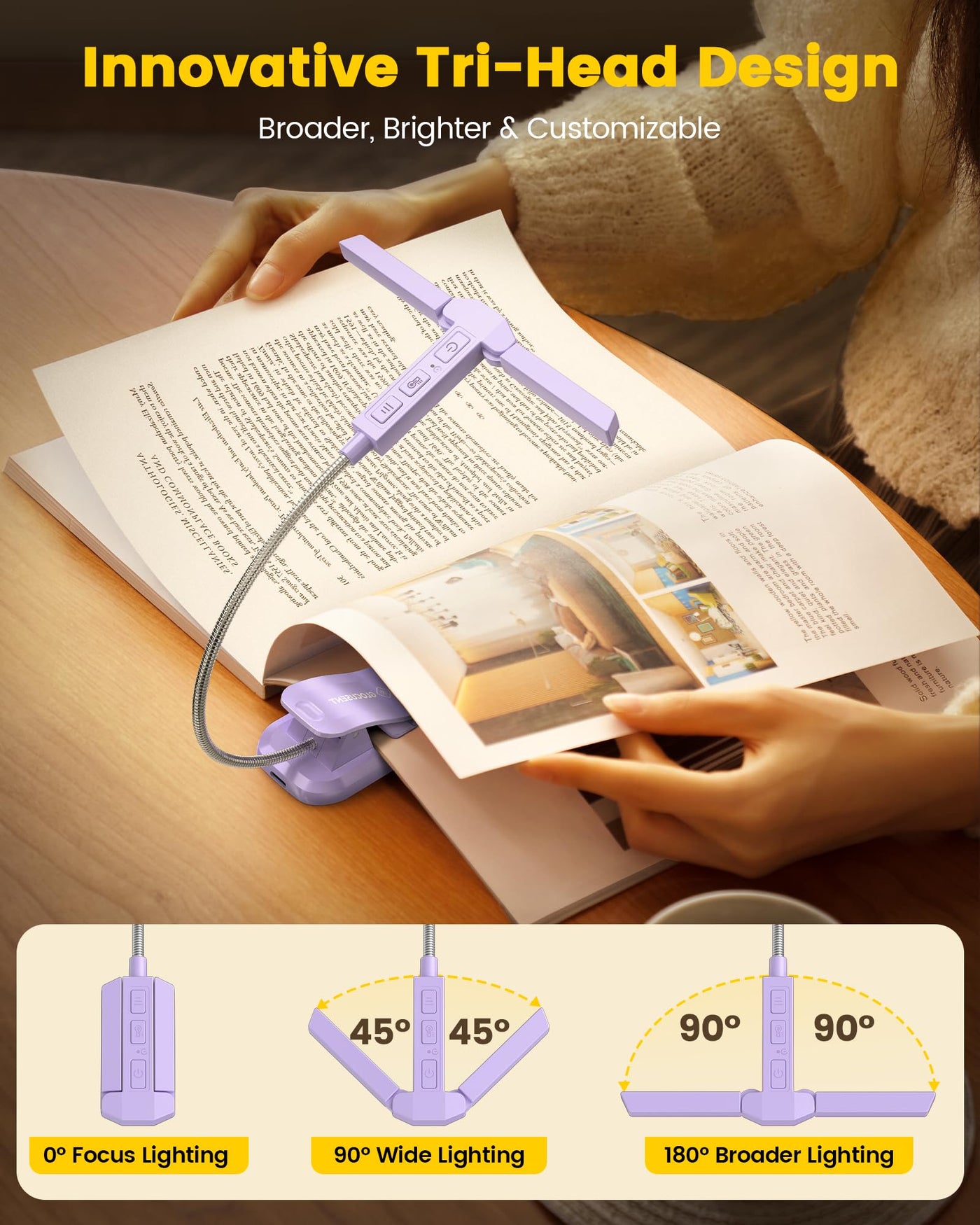 - **Tri-Head Design for Enhanced Lighting**: Featuring a unique T-shaped design, this book light can transform from a single vertical beam into two joint horizontal lights, providing a wider illumination area perfect for larger books. With 27 advanced LEDs, it delivers bright and uniform lighting tailored to your needs.