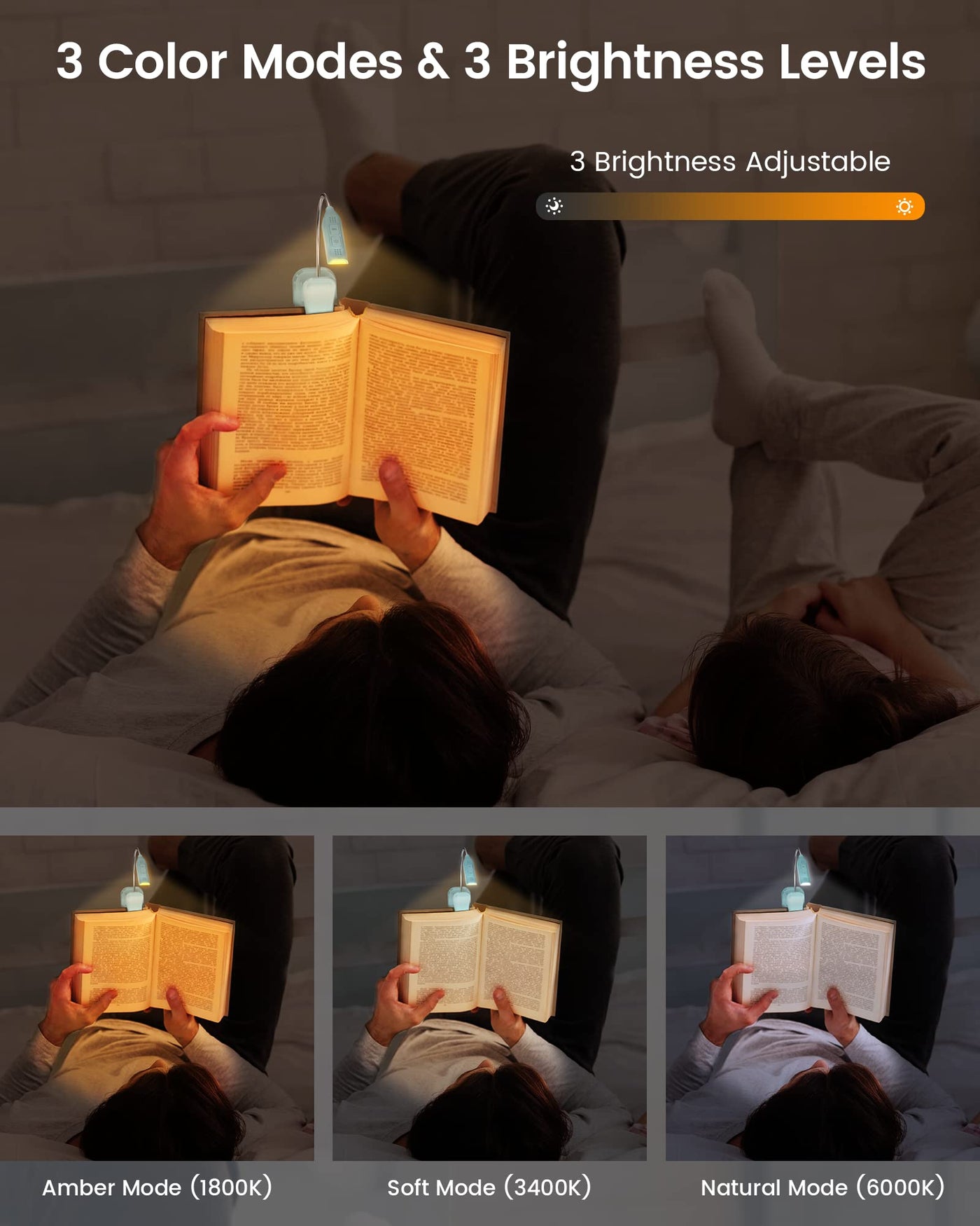 Q: What are the different color modes available on the Glocusent Willow Book Light?A: The Glocusent Willow Book Light features three color modes: amber mode (1800K), soft mode (3400K), and natural mode (6000K). Each mode is designed to cater to different reading environments, with the amber mode providing a warm light that is easy on the eyes, the soft mode creating a cozy ambiance, and the natural mode mimicking daylight for enhanced focus.