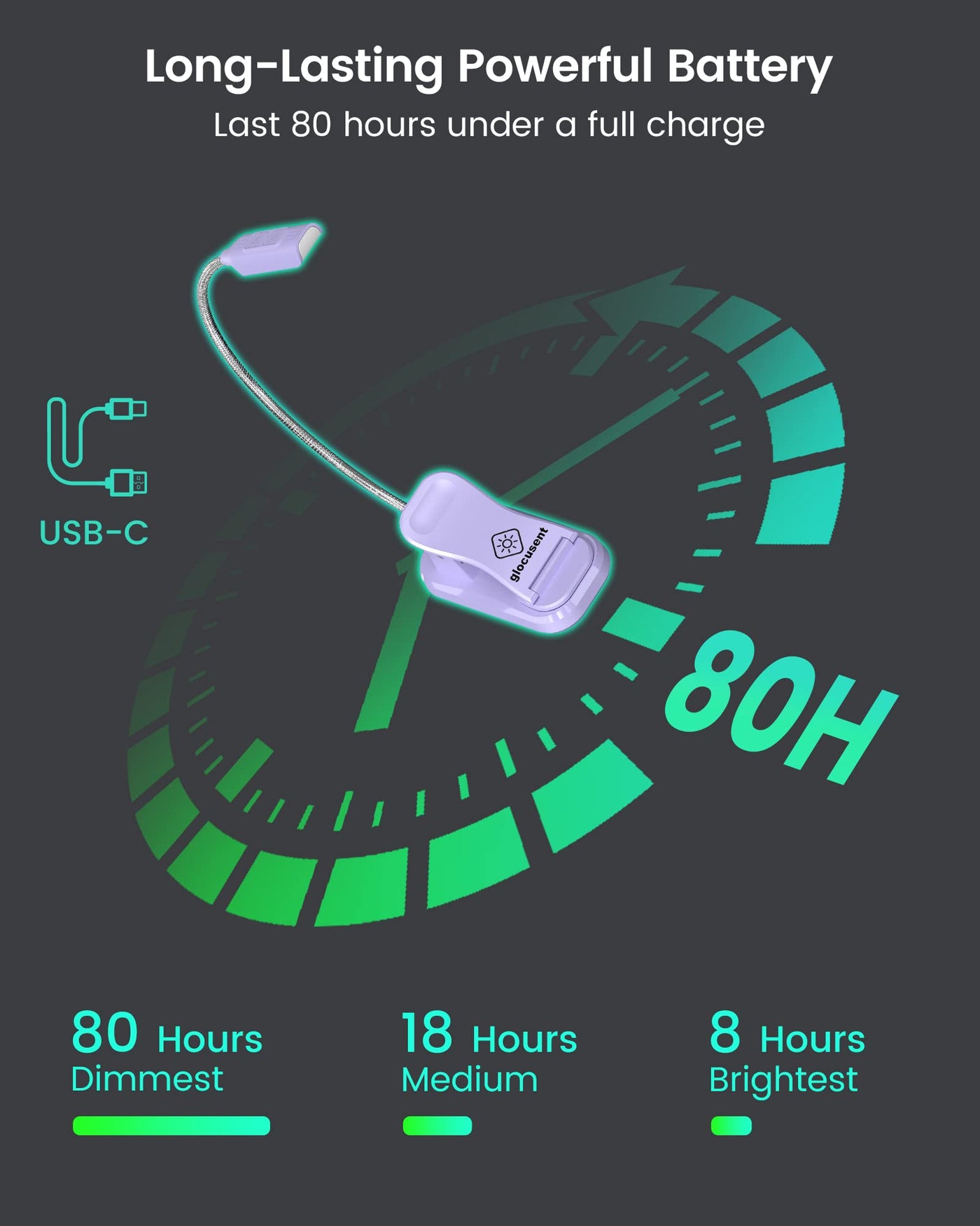 Q: How long does the battery last on a single charge?A: The Glocusent Willow Book Light boasts an impressive runtime of up to 80 hours on the dimmest setting. This long-lasting battery life is ideal for avid readers, ensuring you won't need to recharge frequently while enjoying your favorite books.