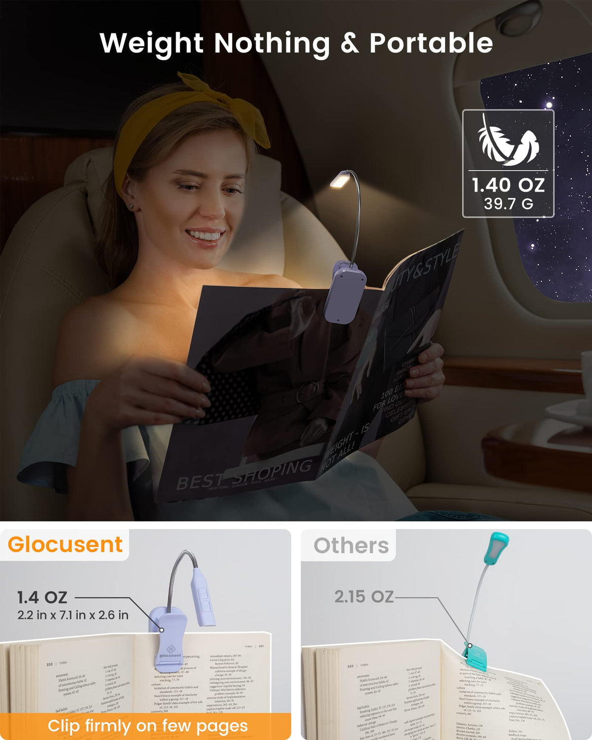 Q: Is the Glocusent Willow Book Light lightweight and portable?A: Yes, the Glocusent Willow Book Light is incredibly lightweight, weighing only 1.4oz, making it lighter than an egg. Its compact design allows you to easily clip it onto your book without causing any damage or adding extra weight, making it perfect for reading on the go.