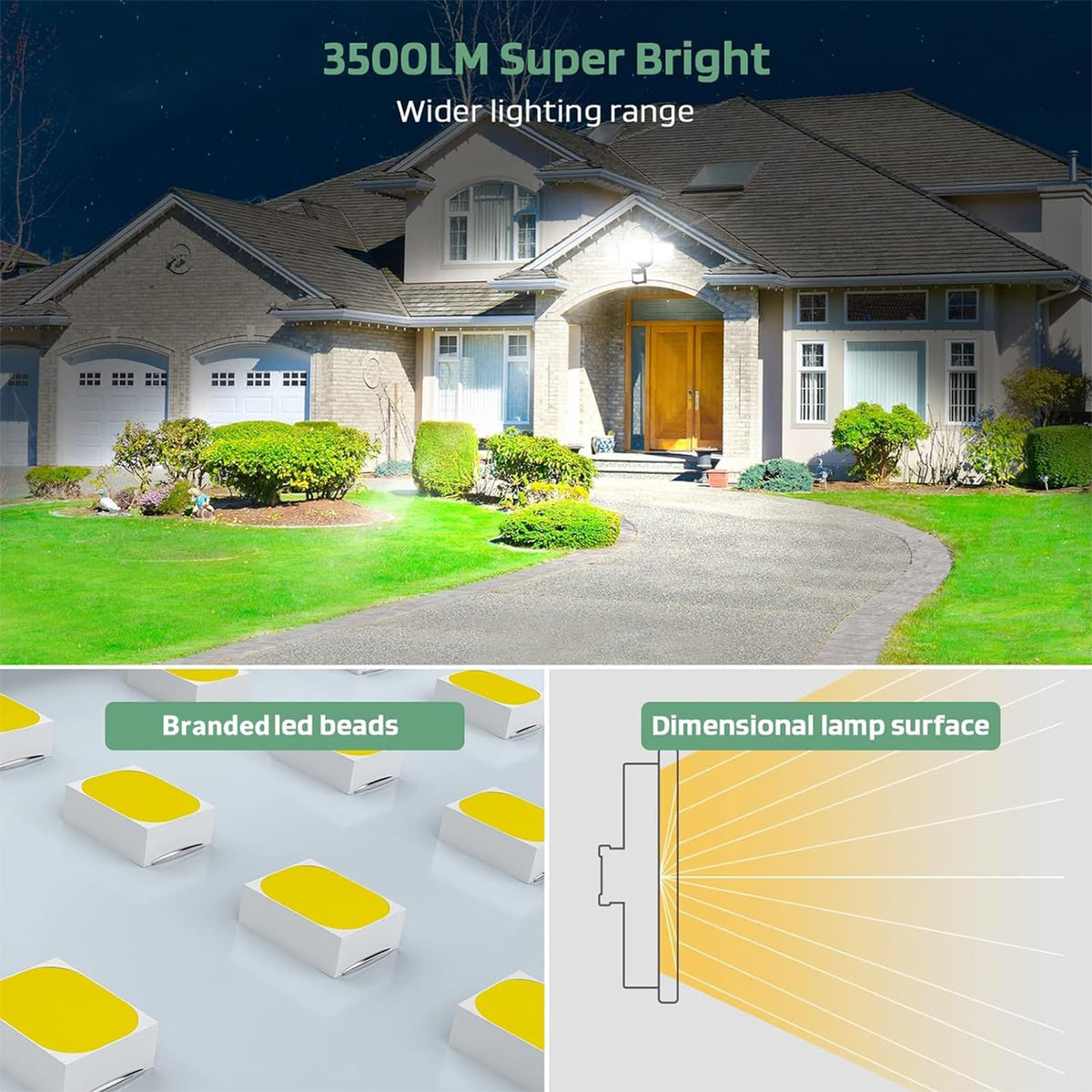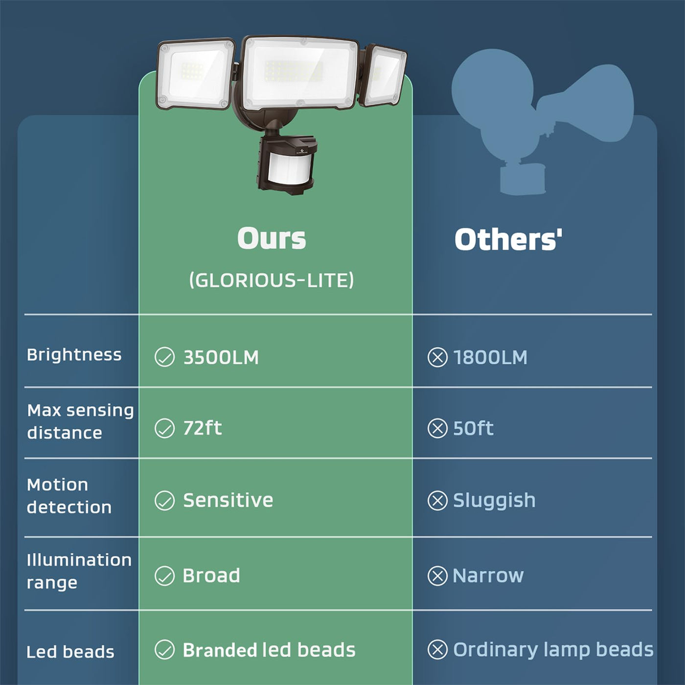 - **High Brightness & Efficiency**: The 35W GLORIOUS-LITE flood light delivers a powerful 3500 lumens of illumination, making it perfect for garages, doorways, patios, and porches. Experience up to 80% savings on electricity bills compared to traditional always-on lights.