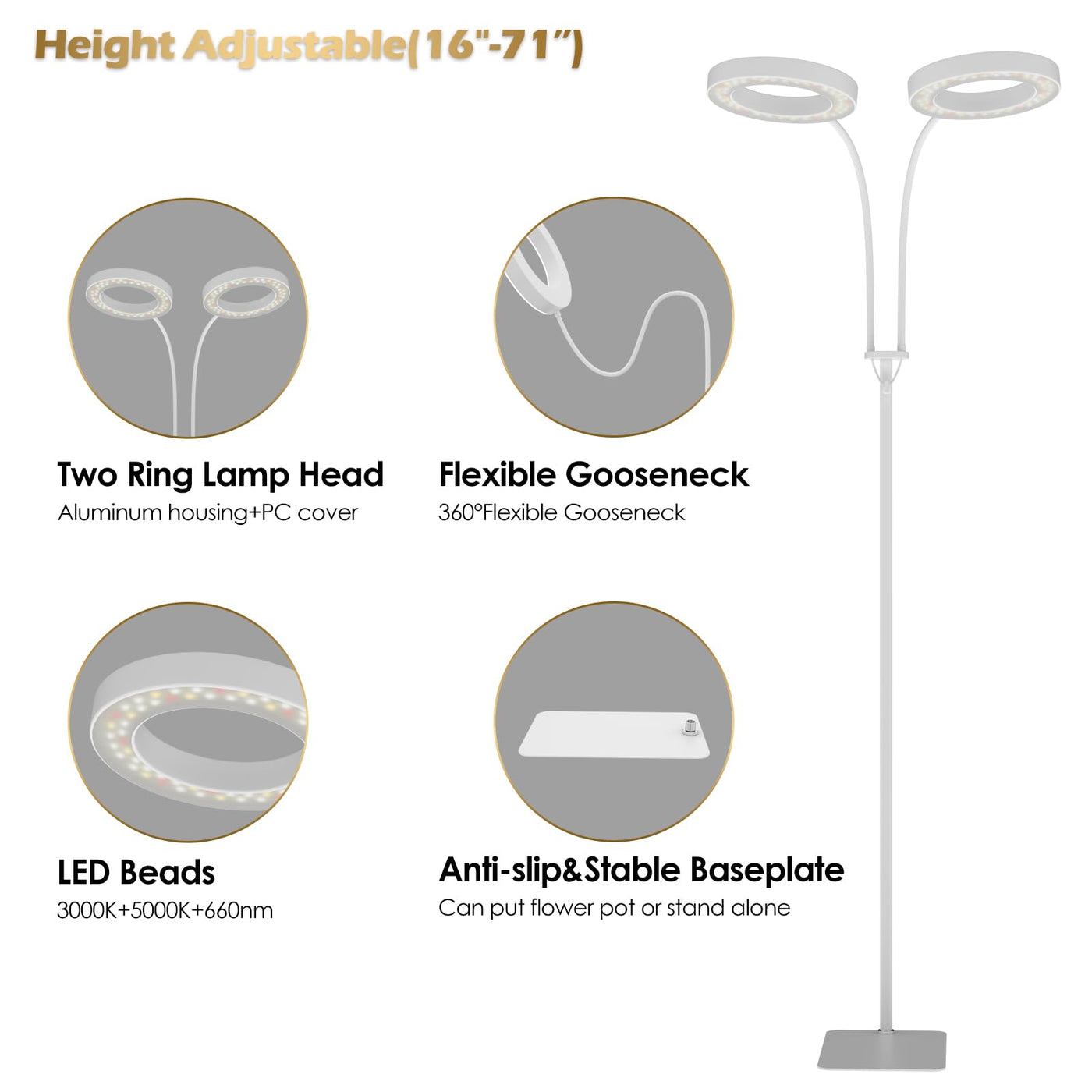 Glowrium Grow Light With Stand,2-Head Led Plant Light For Indoor Plants, Full Spectrum Grow Lamp, 3/9/12H Timer, 6 Dimmable Levels, 3 Lighting Mode, Adjustable Height White