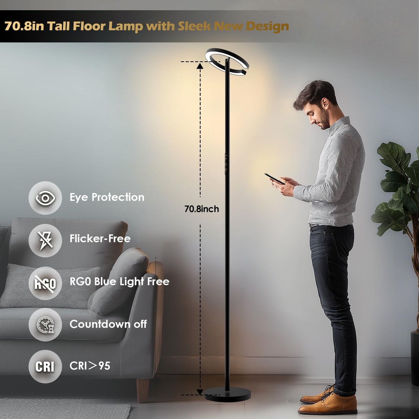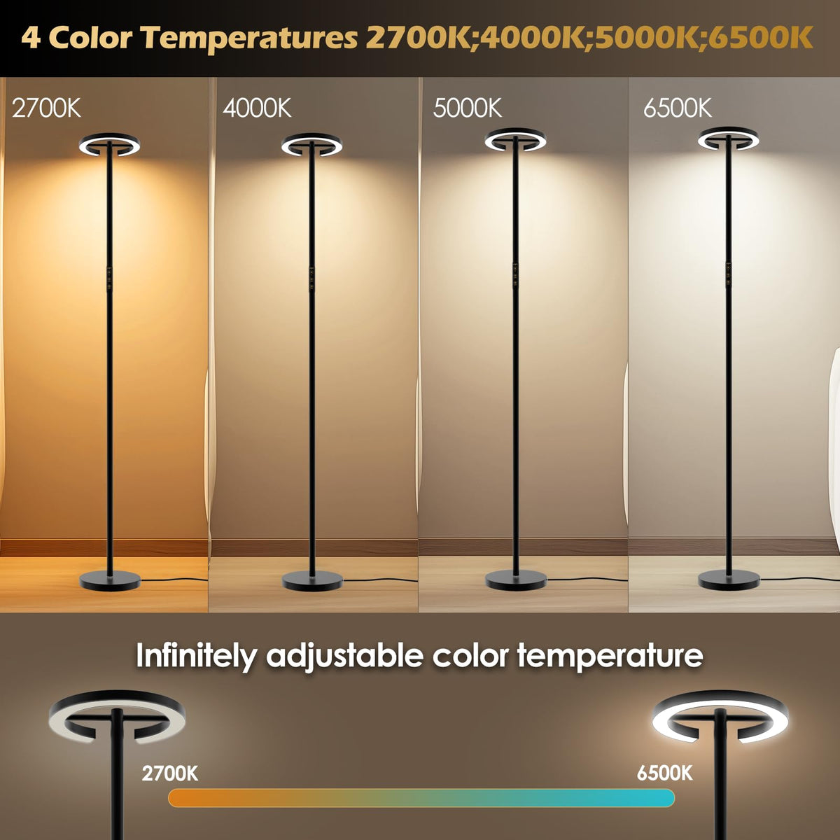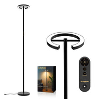 Q: What are the benefits of using the GLOWRIUM Floor Lamp with Remote?A: The GLOWRIUM Floor Lamp offers modern LED technology with stepless dimming and 4 adjustable color temperatures ranging from 2700K to 6500K. This allows you to create the perfect ambiance for any activity, whether it's reading, relaxing, or working. Additionally, it features dual control options, including touch and remote control, making it convenient to adjust settings from a distance.