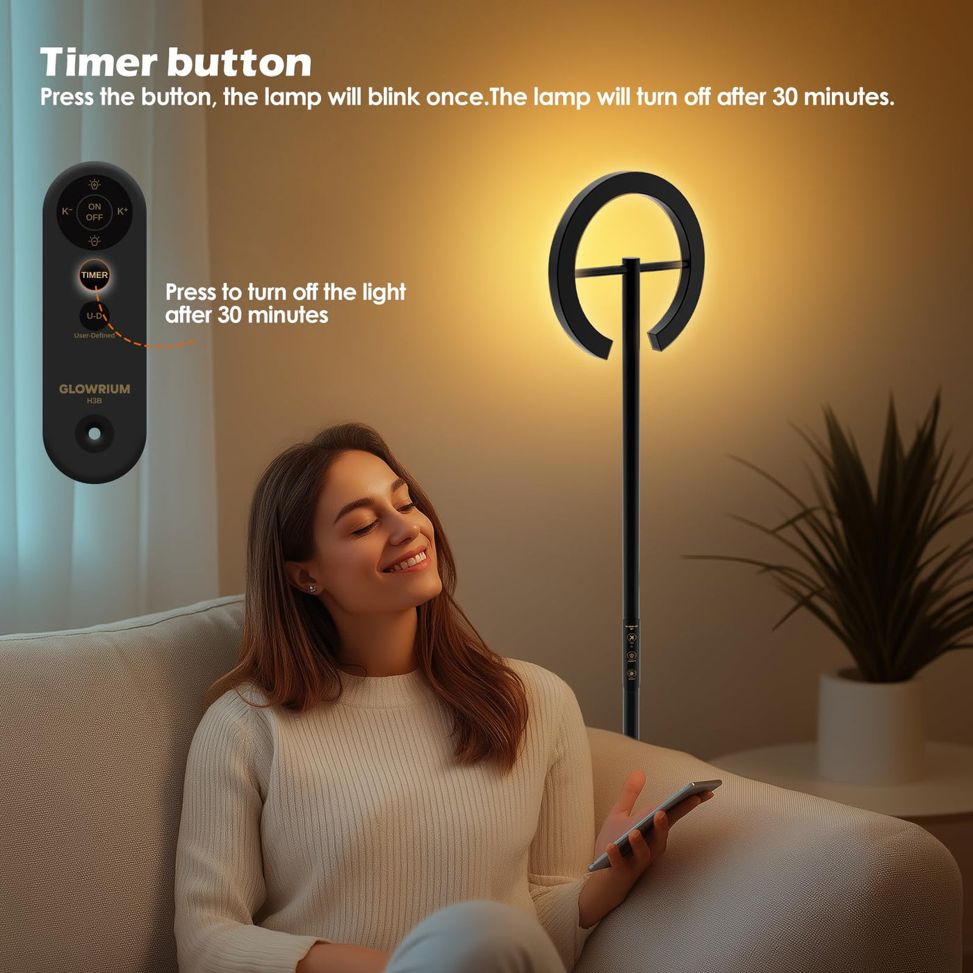 Q: How does the timer function work on this floor lamp?A: The timer function on the GLOWRIUM Floor Lamp allows you to set a 30-minute countdown with a simple press of the timer button. Once activated, the lamp will blink once to confirm the setting and automatically turn off after 30 minutes, making it ideal for bedtime or energy-saving purposes.