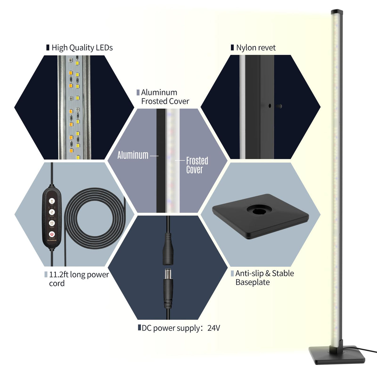 Q: What materials are used in the construction of the GLOWRIUM grow light?A: The GLOWRIUM Standing Grow Light is made from durable aluminum and PC materials. The lampshade is designed with a frosted finish to provide soft, non-dazzling light, while the aluminum body ensures excellent heat dissipation.