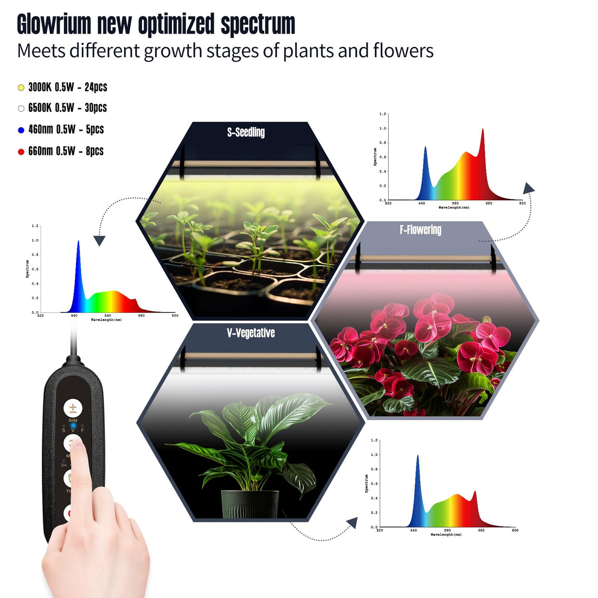 Q: What are the light modes available on the GLOWRIUM Standing Grow Light?A: The GLOWRIUM Standing Grow Light features three light modes designed for different growth stages of plants: vegetative, flowering, and seedling. This ensures that your plants receive the appropriate spectrum of light for optimal growth.