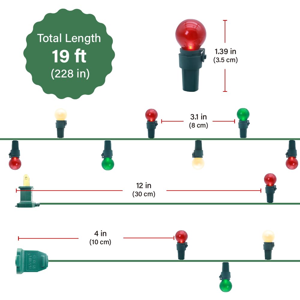 GlowVibe Christmas Lights String - 19FT, 70 LED G15 Glass Globe, Red White Green, ETL Certified