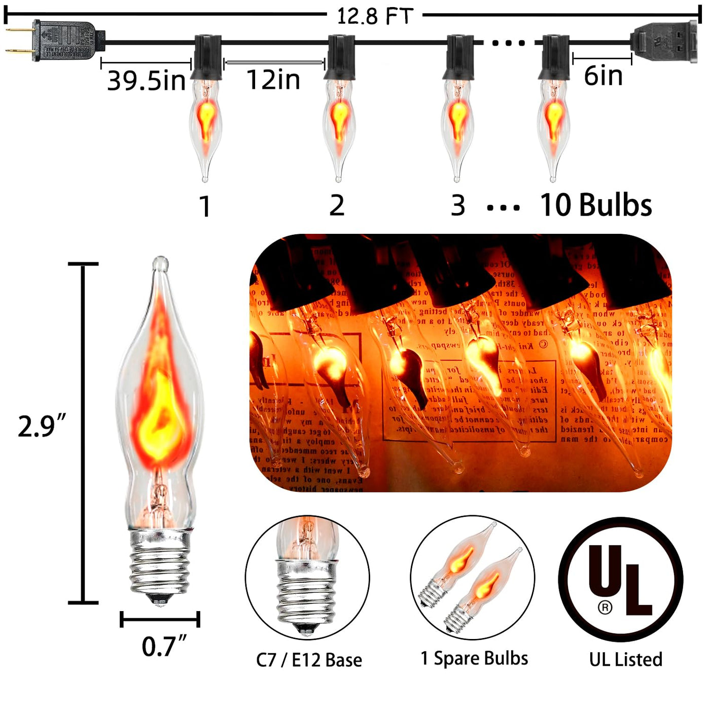 Packaging includes 12.8Ft Flickering Flame String Lights with 12 Pack Clear C7 Flame E12 Light Bulbs 2 Spare C18 Bulbs Black Wire