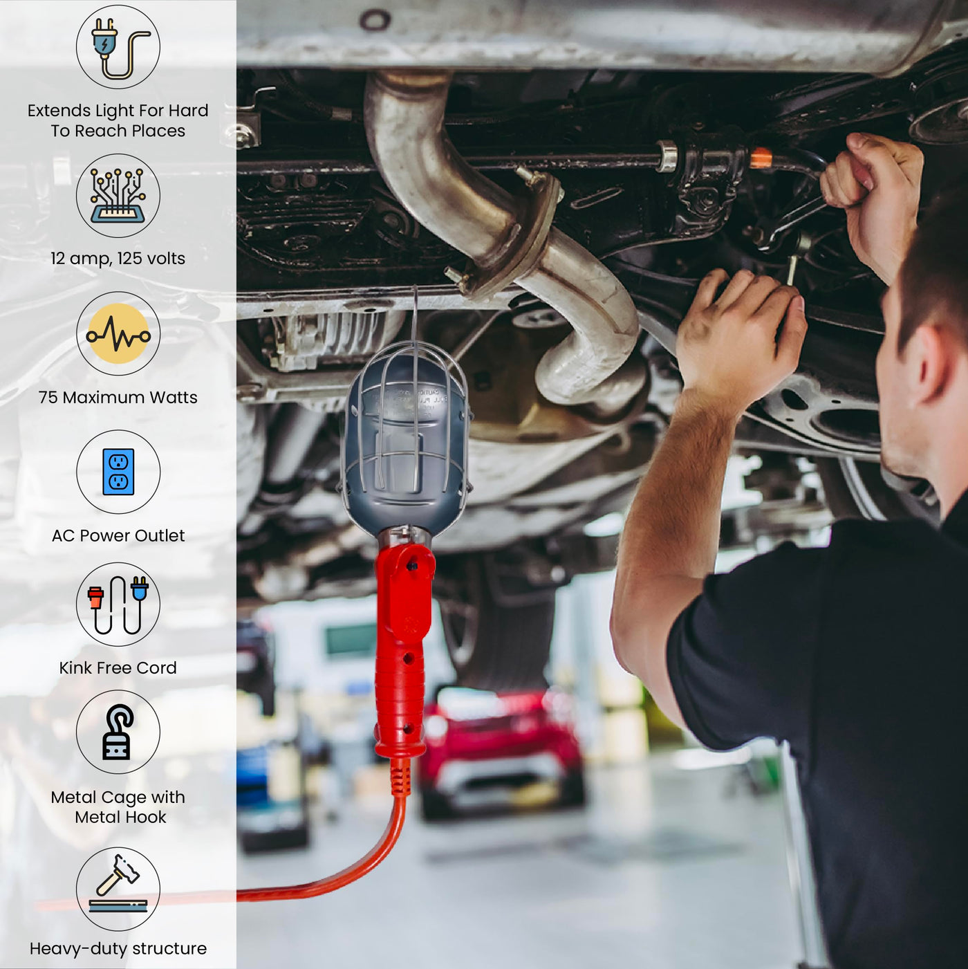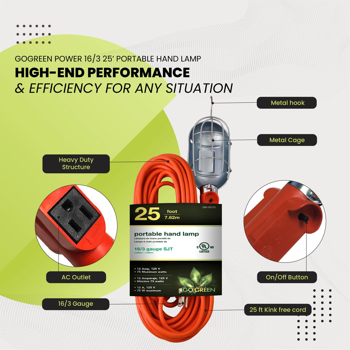 Go Green Power Inc. 25Ft Portable Hand Lamp With 16/3 Kink-Free Cord (Bulb Not Included) - Durable Construction, Swivel Hook, An