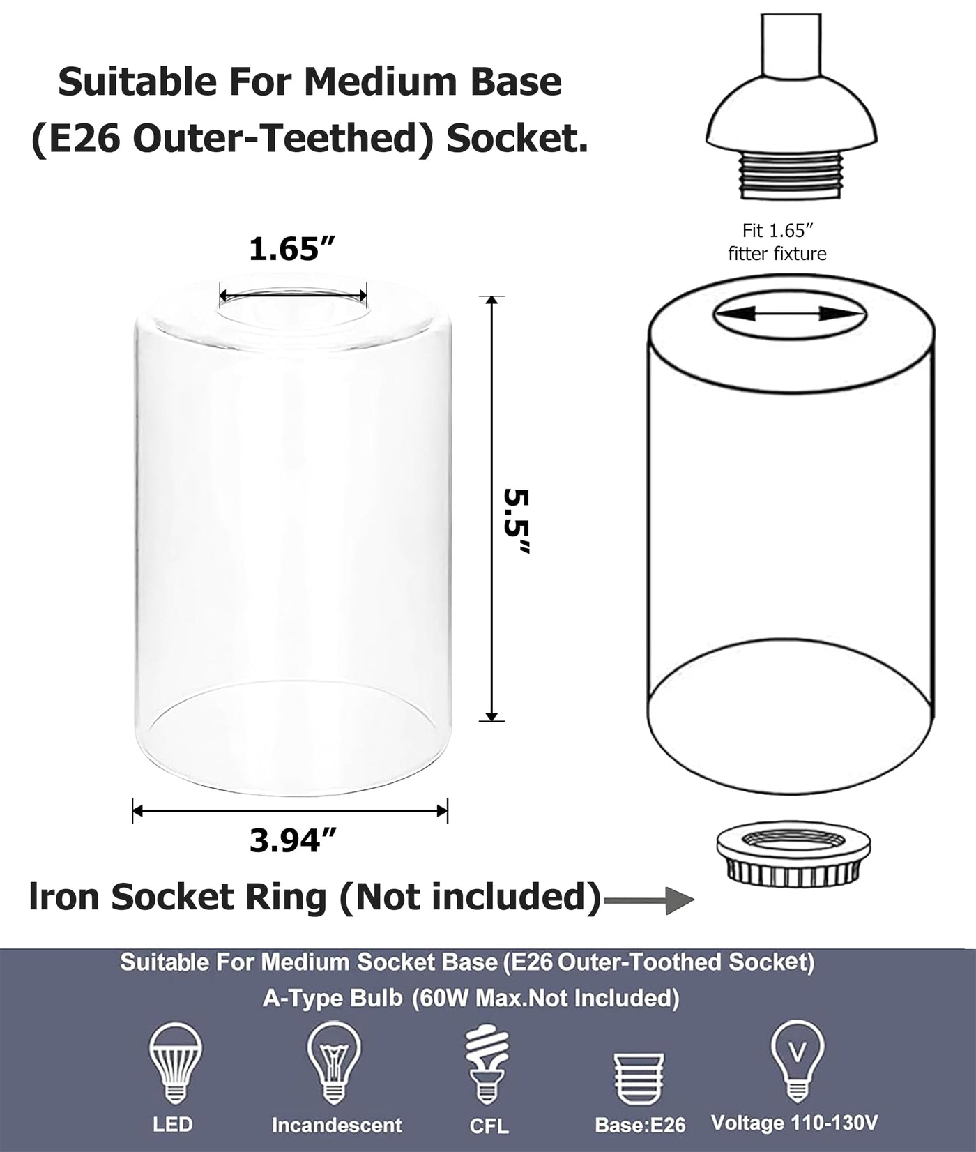 Q: What are the dimensions of the GO&SO glass lamp shades?A: The GO&SO glass lamp shades have a height of 5.51 inches, a diameter of 3.94 inches, and a fitter size of 1.65 inches.