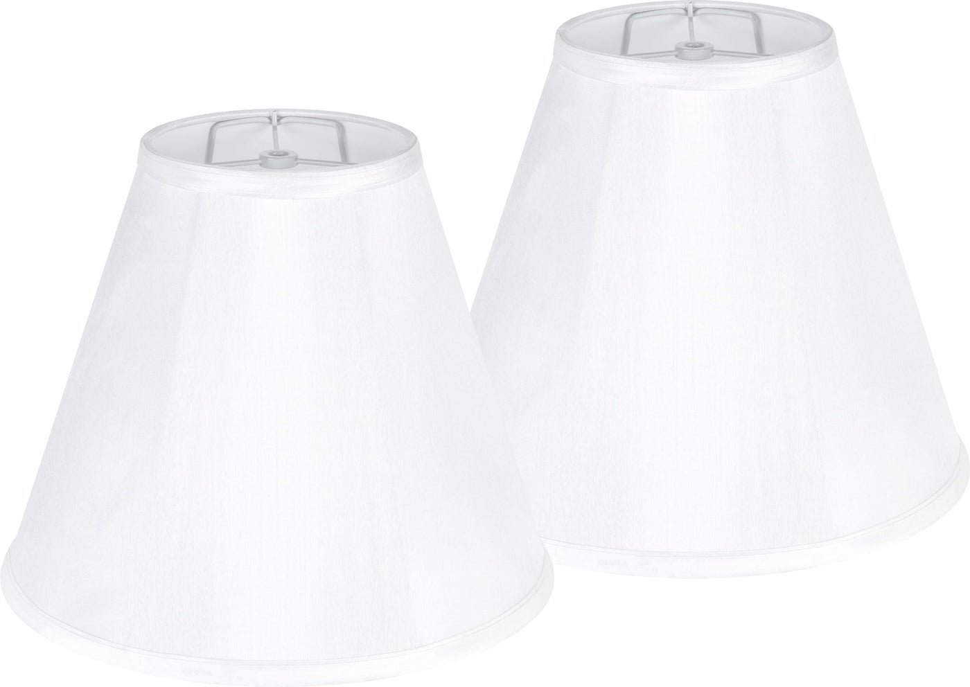 Q: What materials are used in the construction of these lamp shades?A: The lamp shades are made from imitated silk material with a white shade liner and self-trim at the top and bottom, providing an elegant look.