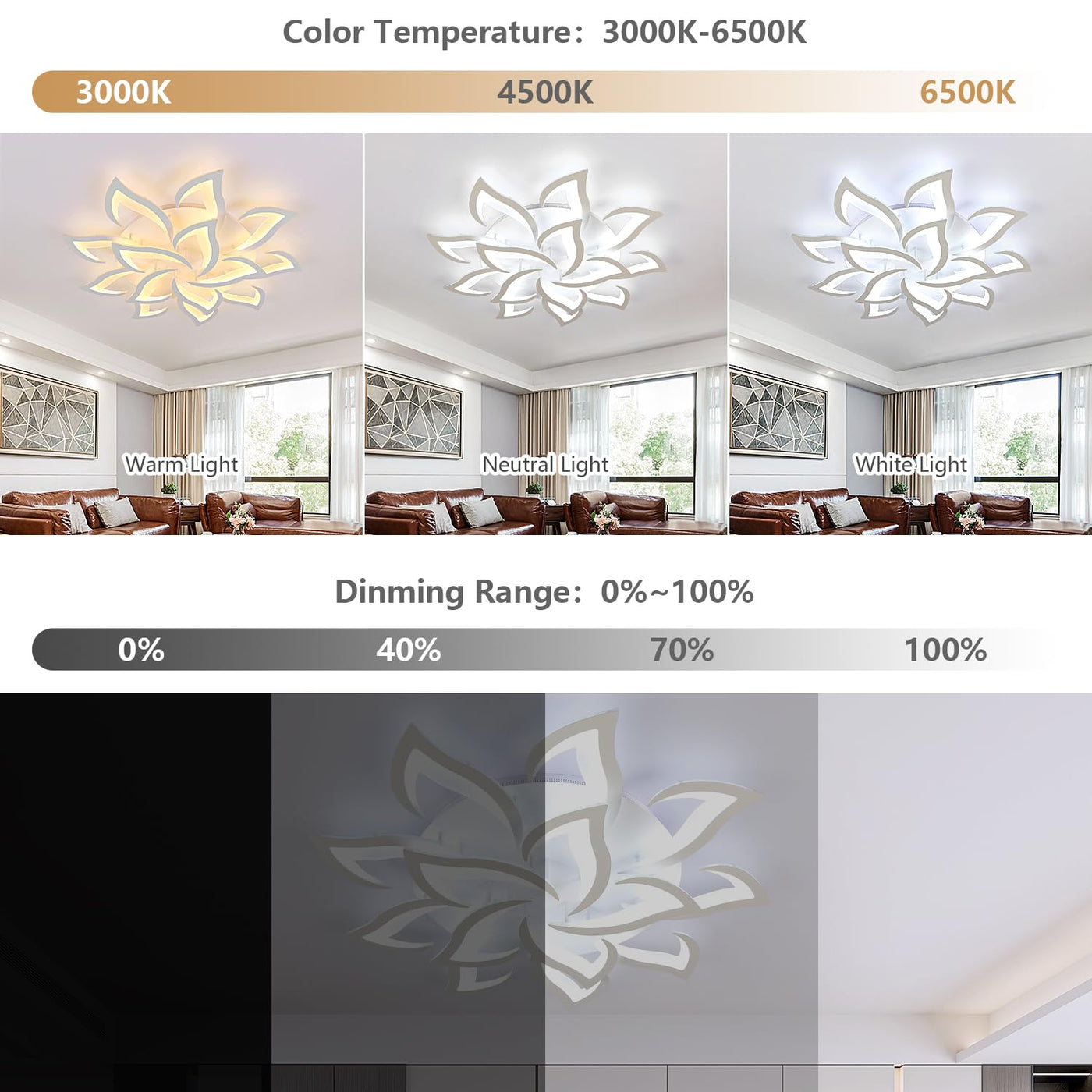 Type: Modern Ceiling Light Color: White Style: Modern Wattage: 100W Voltage: 110V Function: Memory Function; Timing Function; Stepless Dimming; Night Light Mode Control Method: Remote Control/APP Control Color Temperature: 3000K -6500K Brightness: 0%-100% Product Size: L 37.79*W 37.79*H 4.72 Lumen Output:4200lm Application: Bedroom, Living Room, Dining Room, Kitchen. Warm Tips: Please cut off the power supply when Installing, cleaning lamps. Product Dimension: 37.79*37.79*4.72 in Material: Acrylic, Metal Package Contains: 1* Modern Ceiling Light1* Remote Control1* User Manuel1* Installation Package Installation:*According to the instruction to open the back base of the ceiling lamp by hand*Cut off the main power supply and fix the back base of the ceiling light on the wall with screws*Connect the live wire and neutral wire, no need for earth wire here*According to the right direction, close the ceiling lamp What do you get if you buy a Goeco ceiling light? Light efficiency guarantee: It can start instantly without strobe and can make the light source fully heat dissipated. Comfortable environment: We incorporate lifestyle into the design. We hope the lighting system can create a comfortable, warm and cultural living space for you.