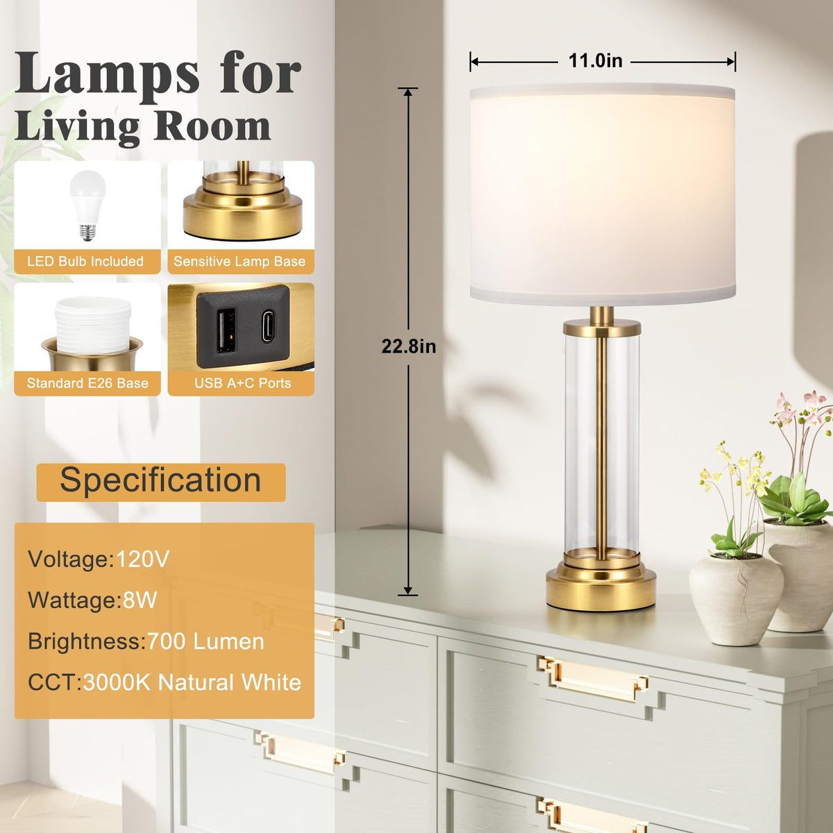 Gold Bedroom Lamps Set Of 2 - Touch Bedside Lamp For Night Stands With Usb C+A, 3 Way Dimmable Nightstand Table Lamps For Living