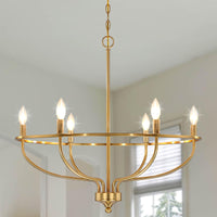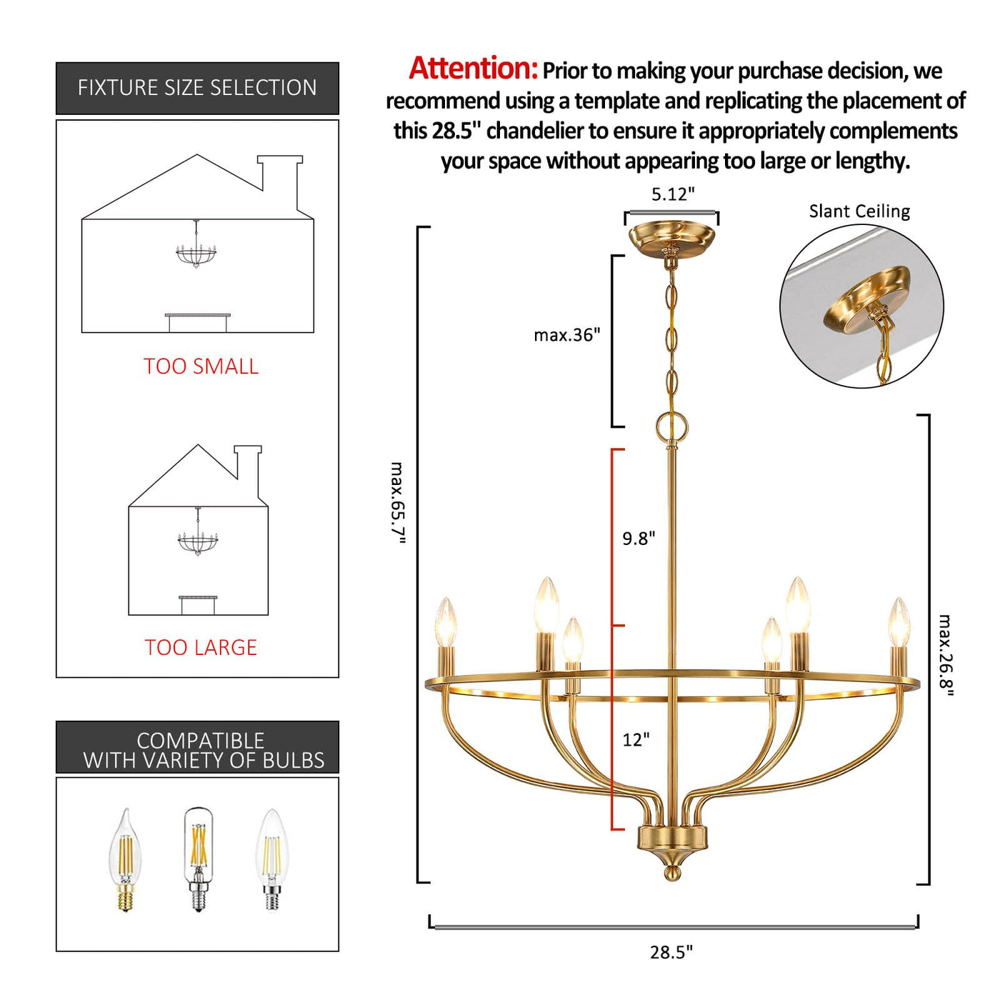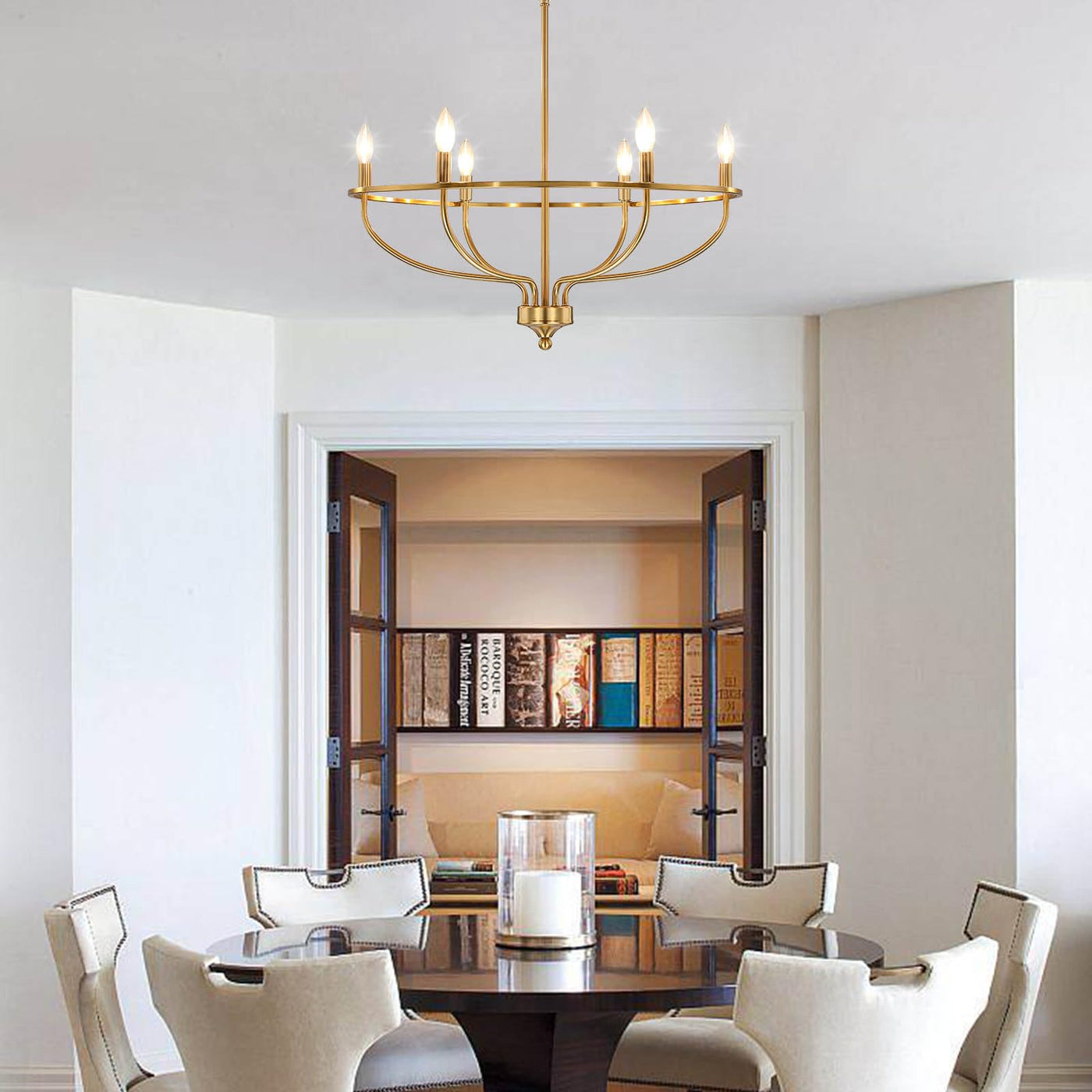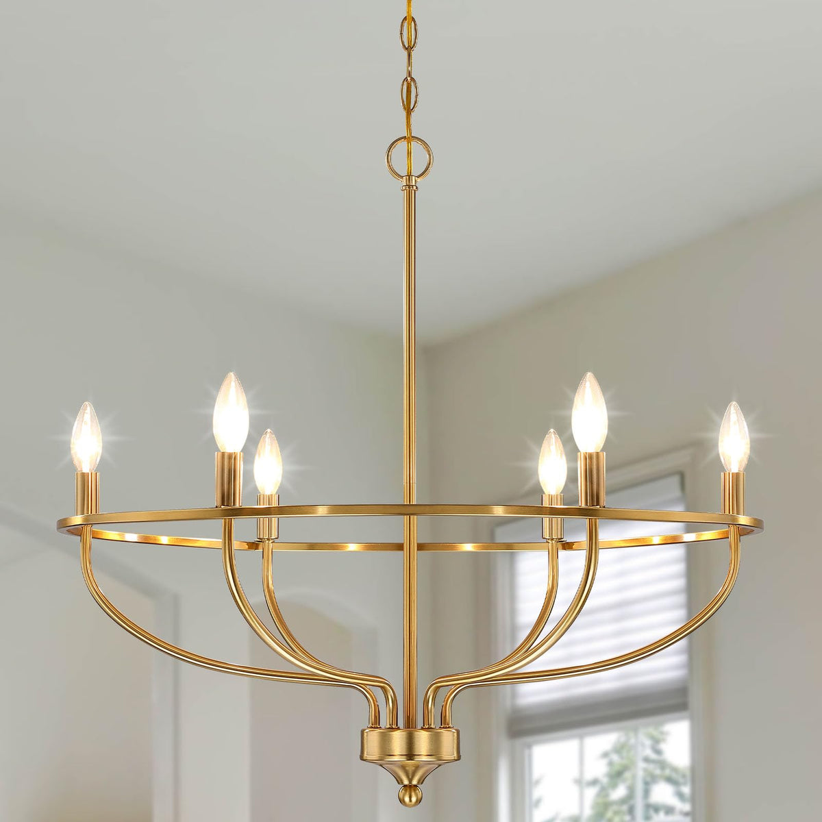 Gold Chandelier For Dining Room, 28.5 Inch Diameter Modern Farmhouse Candle Chandelier Light Fixture Over Table, 6-Light Brass C