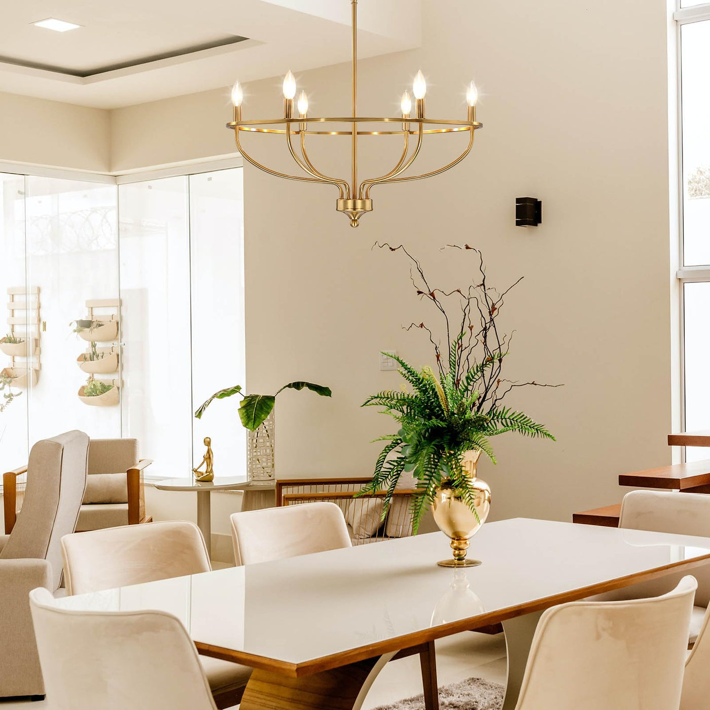 Gold Chandelier for Dining Room, 28.5 Inch Diameter Modern Farmhouse Candle Chandelier Light Fixture Over Table, 6-Light Brass Chandelier Lighting for Kitchen, Bedroom, Living Room (E12 Base)