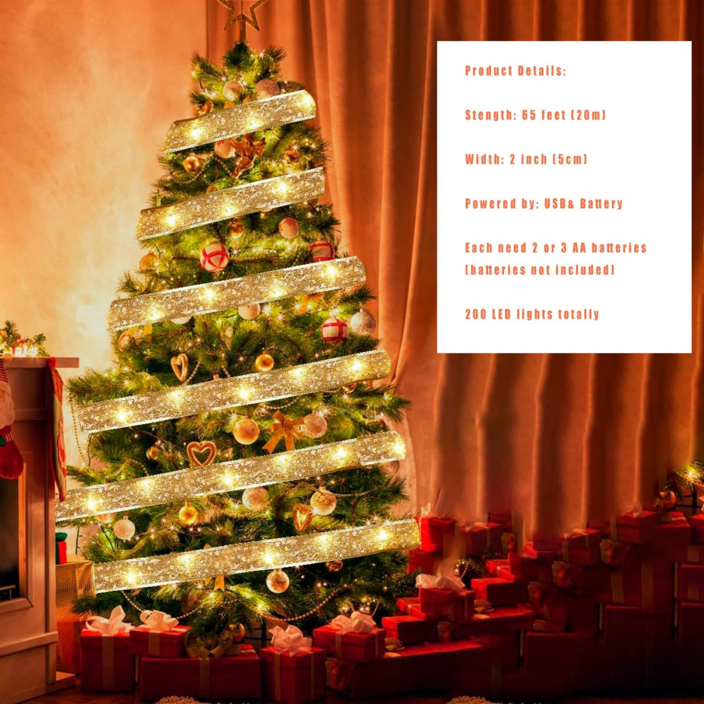Q: What are the dimensions and length of the Gold Christmas Tree Decorations Ribbon Lights?A: The Gold Christmas Tree Decorations Ribbon Lights are 64ft long and feature 200 LED lights, providing ample length for decorating your indoor and outdoor spaces.