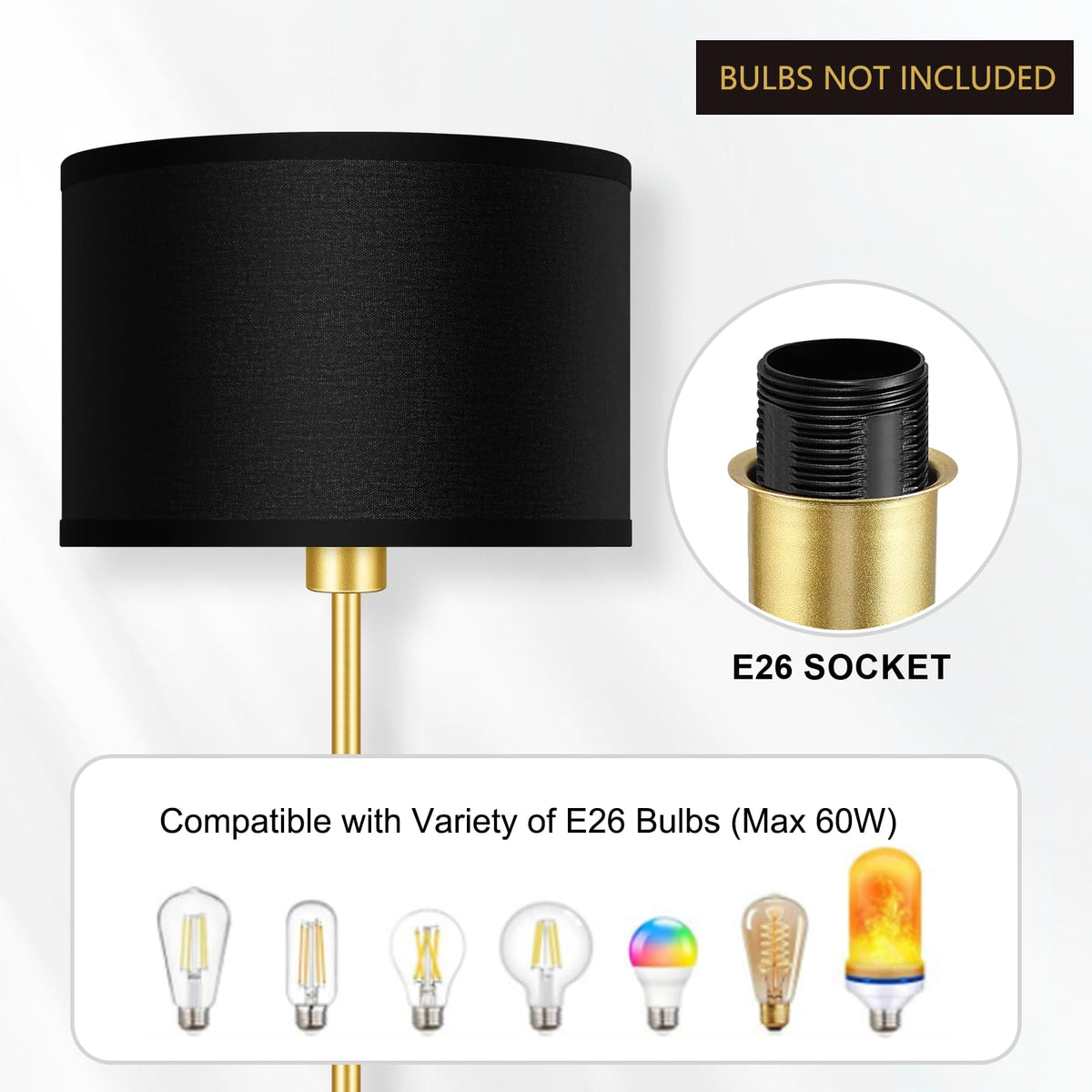 Q: What type of bulb is compatible with the Gold Floor Lamp?A: The Gold Floor Lamp is compatible with any E26 base light bulb, allowing you to choose bulbs with different brightness levels up to 60W Max. This flexibility enables you to customize the lighting ambiance in your living room, bedroom, or office.
