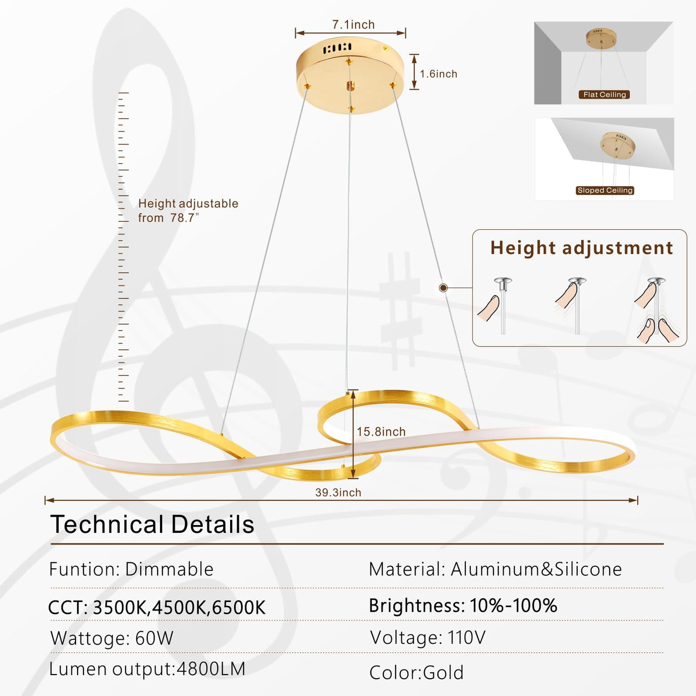 Q: How does the chandelier enhance the overall aesthetic of a room?A: The modern design of the Gold Led Chandelier, with its captivating arrangement of music notes, serves as a stunning focal point. Its elegant gold finish complements various decor styles, adding a touch of contemporary sophistication to any room.