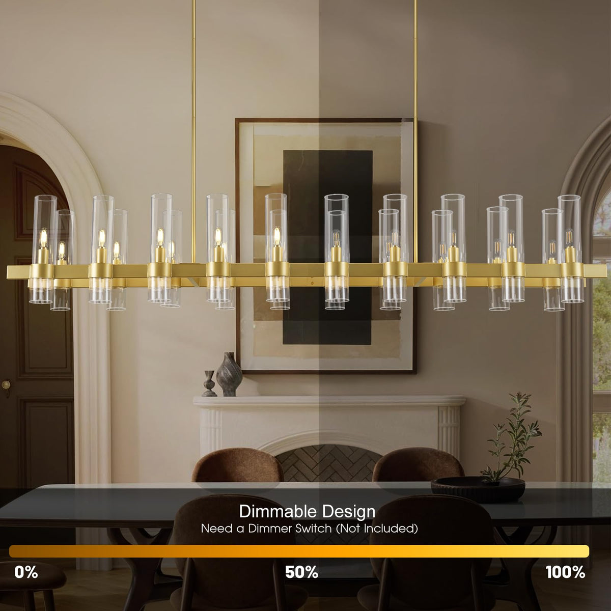 PRODUCT NAME: Gold Linear Chandeliers for Dining Room, 68'' Rectangle Chandelier with Glass, 20-Light Dining Room Chandeliers Over Table, Brass Chandelier for Kitchen Island, Modern Pendant Light(Bulbs Included) SIZE: 68 Inch Chandelier; 11.4''(D) 68''(W) 77''(H) TYPE: Chandelier, Pendant Light, Hanging Light, Ceiling Light COLOR: Gold Chandelier MATERIAL: Metal, Glass LIGHT SOURCE: LED Bulb 16 SPECIAL FEATURE: Stepless Dimming, Adjustable Height STYLE: Farmhouse Chandelier, Rustic Chandelier, Industrial Chandelier, Modern Chandelier, Linear Chandelier LAMPSHADE: Linear Chandelier with Glass Shades Decorate your dining room with our rectangle chandelier. This 68'' gold chandelier is made with premium metal frame and thickened glass lampshade. The chandelier for kitchen island is suitable for dining room, kitchen island, home bar, game goom and office. VARTTYAL modern chandeliers for dining room is perfect to be installed over the dining table. The brass chandelier is an elegant decoration to your living area to provide illumination.
