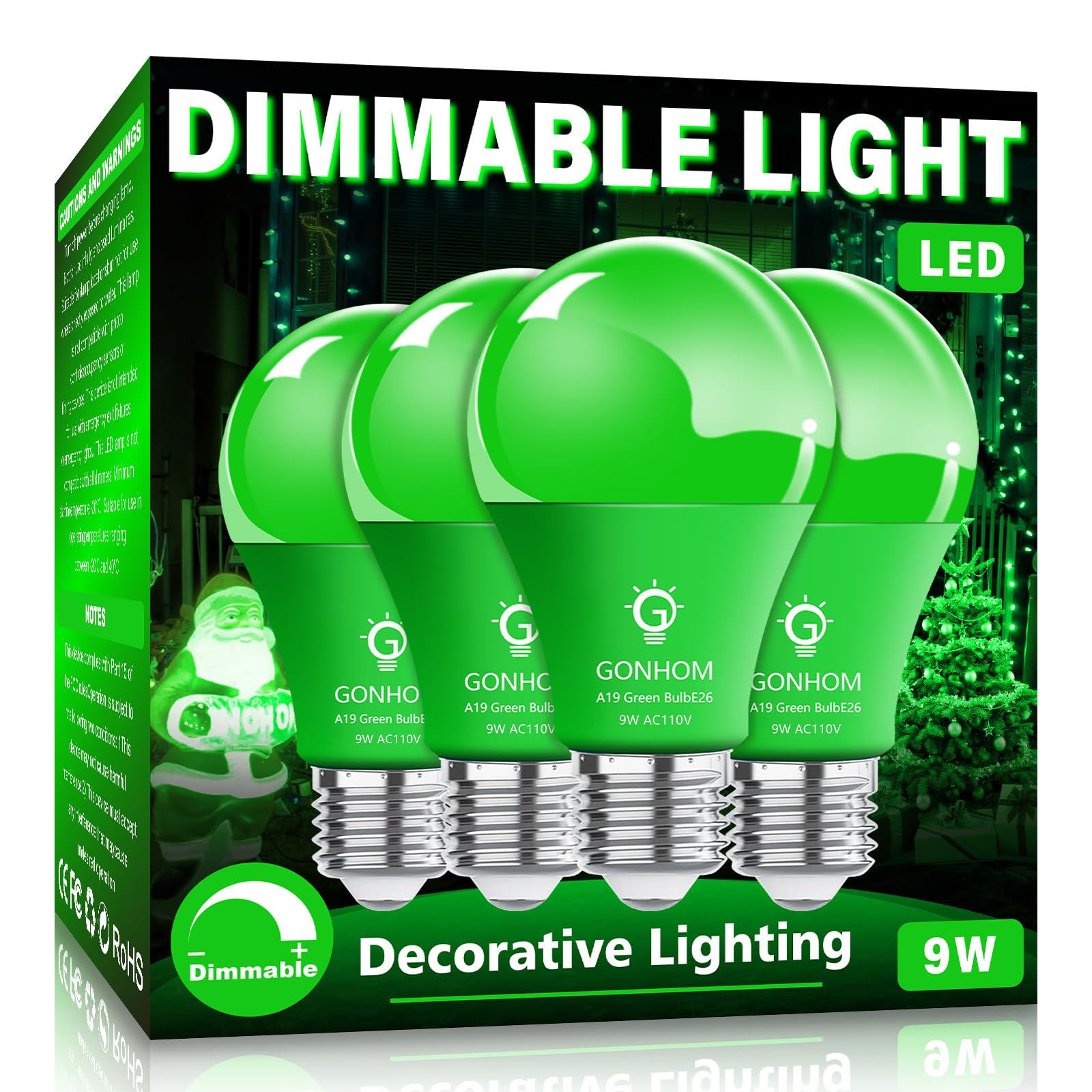 Gonhom 4 Pack A19 9W Green LED Light Bulbs, E26 Base, 100W Equivalent for Parties, Holidays, Halloween Decorations