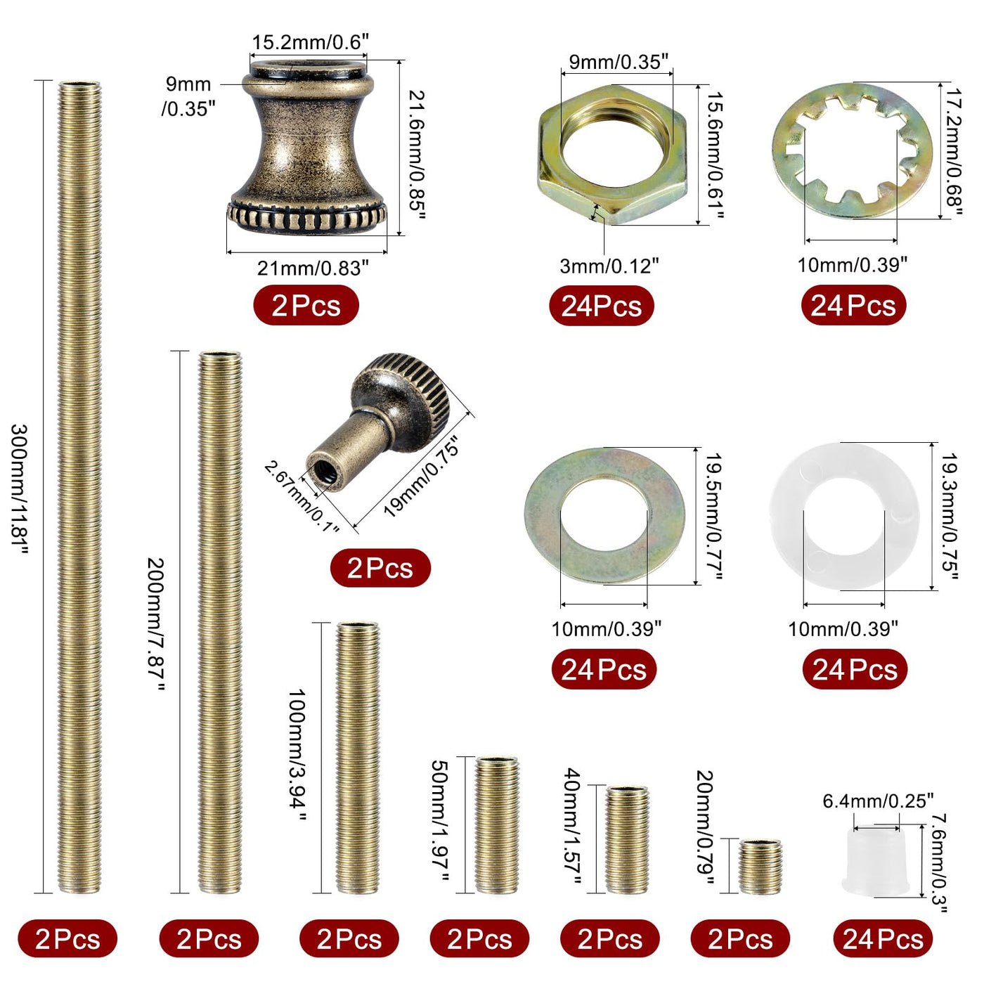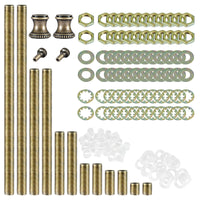 Various Kinds Of Hardware -12Pcs Threaded Lamp Pipes(6 Sizes),2 Copper Pipe Couplings, 2 Brass Switch Knobs,24 Locknuts,24 Wahsers,24 Lock Washers,24 Rubber Wahsers And 24 Pipe Stoppers All In A Set. Buy One Kit, You Can Repaire/Make 2 Lamps And More.