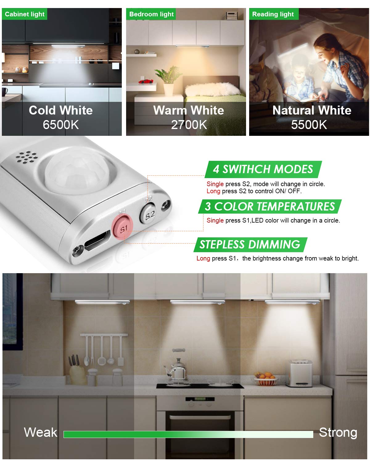 Q: What are the different color temperatures available for this under cabinet light?A: The goodland Under Cabinet Lighting offers three color temperatures: Cool White, Warm White, and Natural White. You can switch between these settings by short pressing the S1 button.