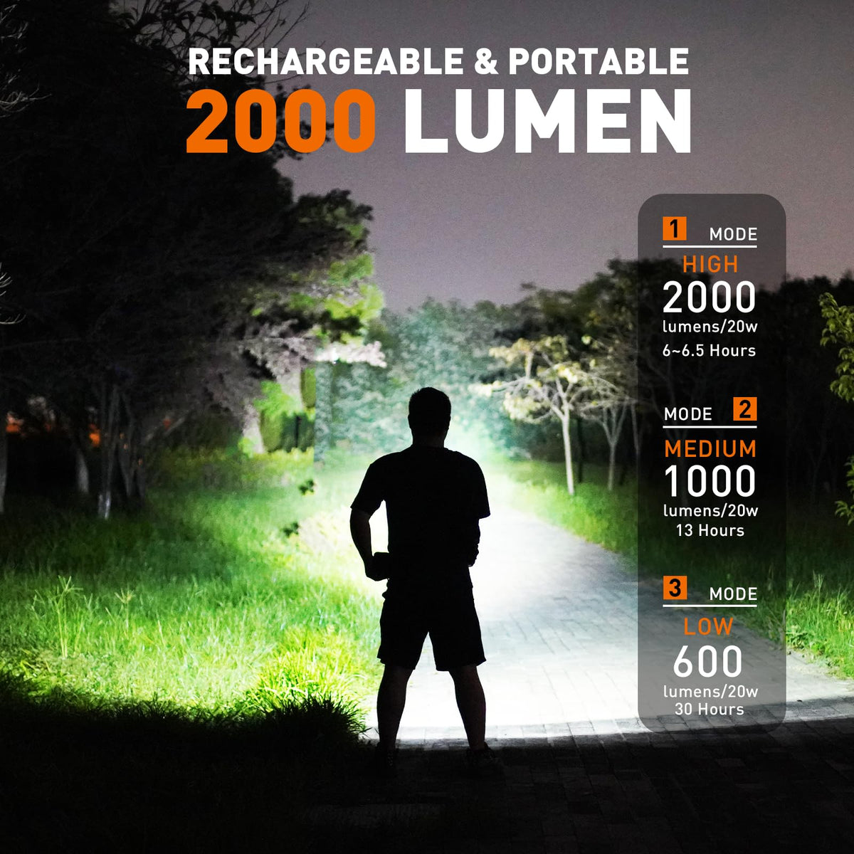 LUMENS 2000 lumens in high mode 1000 lumens in medium mode 600 lumens in low mode