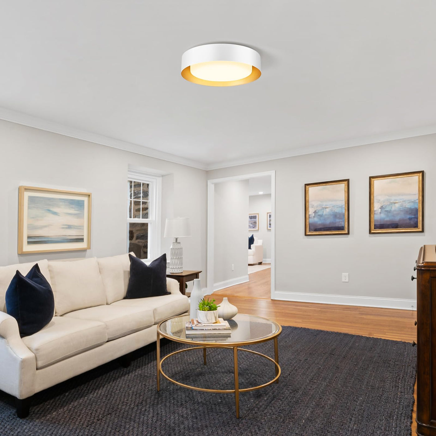 Q: What materials are used in the Goomavi Modern Flush Mount Ceiling Light?A: The Goomavi ceiling light features a minimalist design with a white finish on the outside and a gold finish on the inside. The lampshade is made of white glass, which creates soft, uniform lighting.