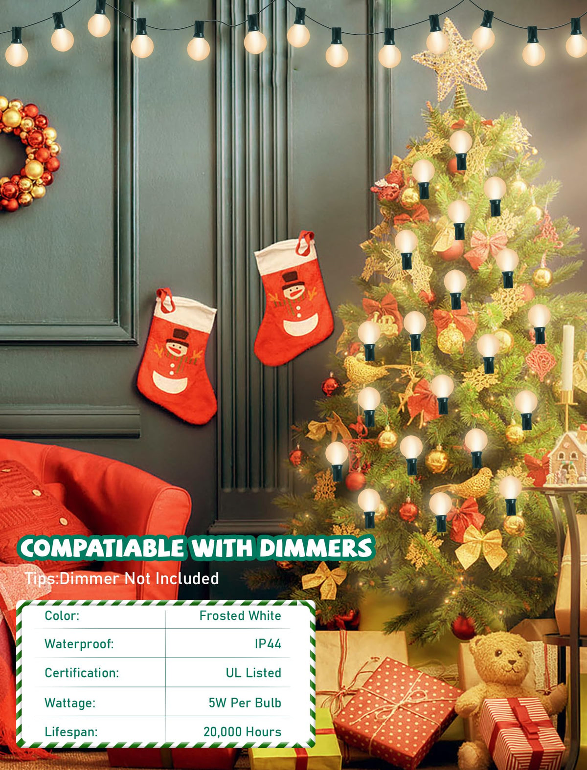 Length: 25 feet, featuring 25 frosted G40 bulbs with 2 extra replacements.