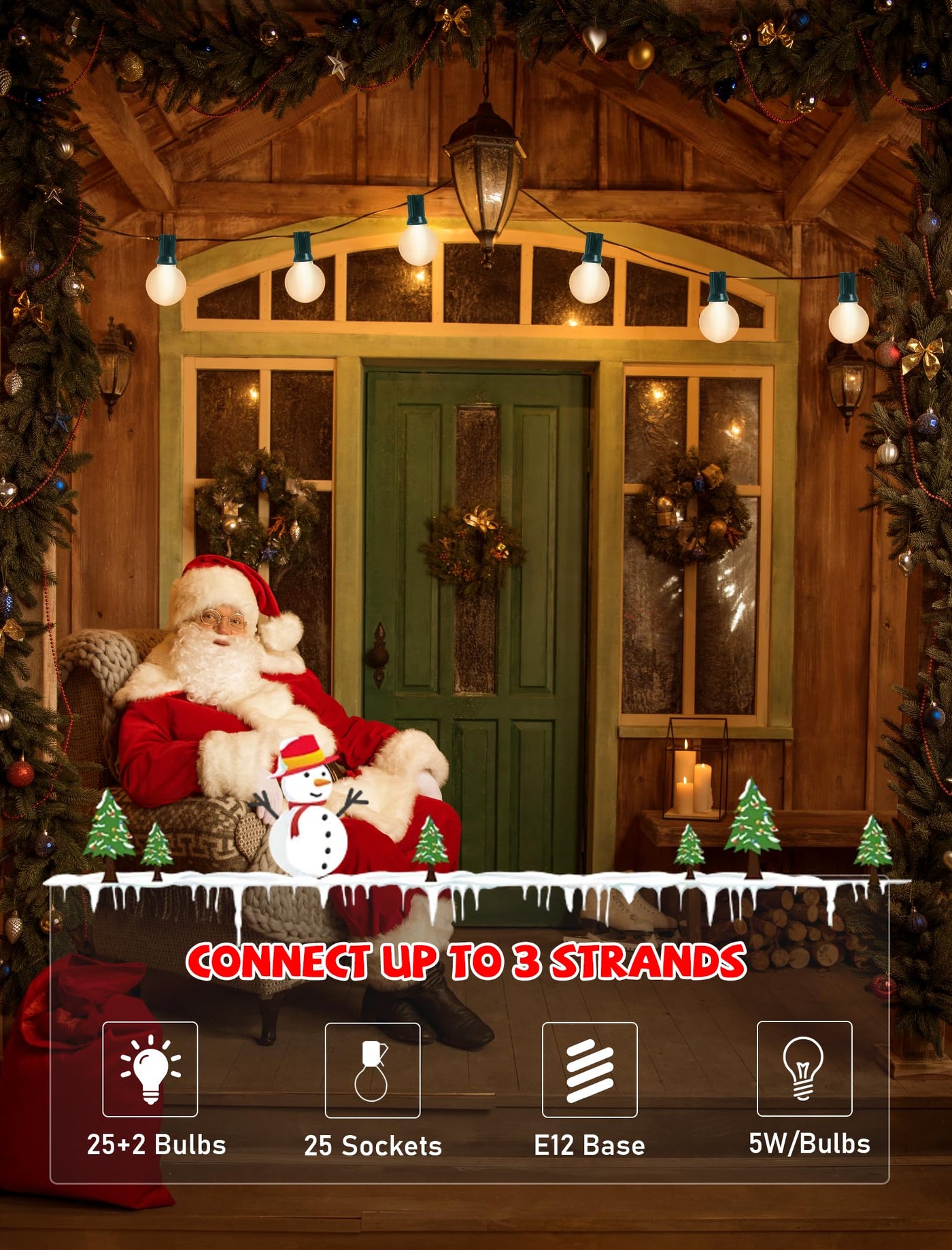 Q: Is it possible to connect multiple strands of these lights together?A: Yes, the G40 Frosted White Christmas Lights are end-to-end connectable, allowing you to connect up to three strands for extended coverage.