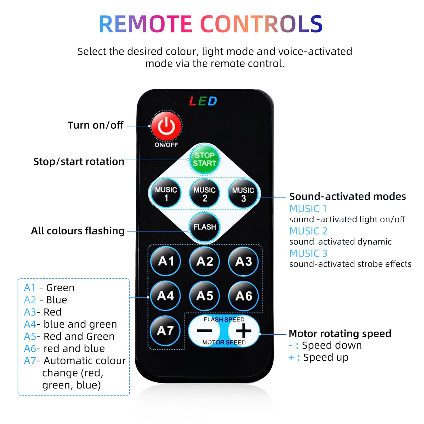 Portable Mini LED Light Globe Palm-sized stage light with 3.6ft/110cm power cord. Can be placed directly on a table, wall corner, or fixed on a wall or roof. Excellent stability. Light weight and easy to carry around. Can be used anytime and anywhere Colourful Magic Ball LED Party Light This rotating magic party light is perfect for all kinds of stage or party lighting. It can create a gorgeous visual lighting effect and romantic atmosphere, not only for holiday parties, but also for bars, coffee shop merchandise windows, shop entrances, outdoor restaurants, ski resorts and more 3 sound activated modes:Music 1: Sound-activated light on/off; Music 2: Sound-activated colour change; Music 3: Sound-activated strobe Lighting Modes:A1 - Green; A2 - Blue; A3- Red; A4- blue and green; A5- red and green; A6- red and blue; A7- Automatic colour change