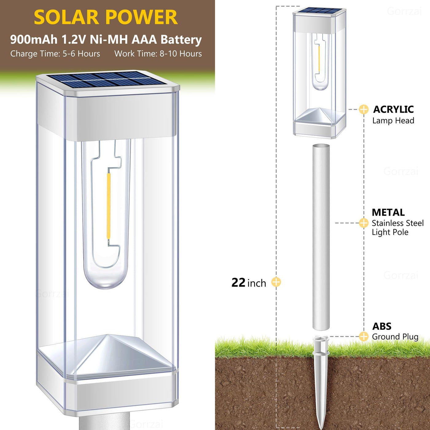 Q: How long do the Gorrzai Solar Pathway Lights last on a full charge?A: The Gorrzai Solar Pathway Lights can last for 10-12 hours on a full charge, thanks to the upgraded solar panels and built-in 900mAh high-capacity battery.