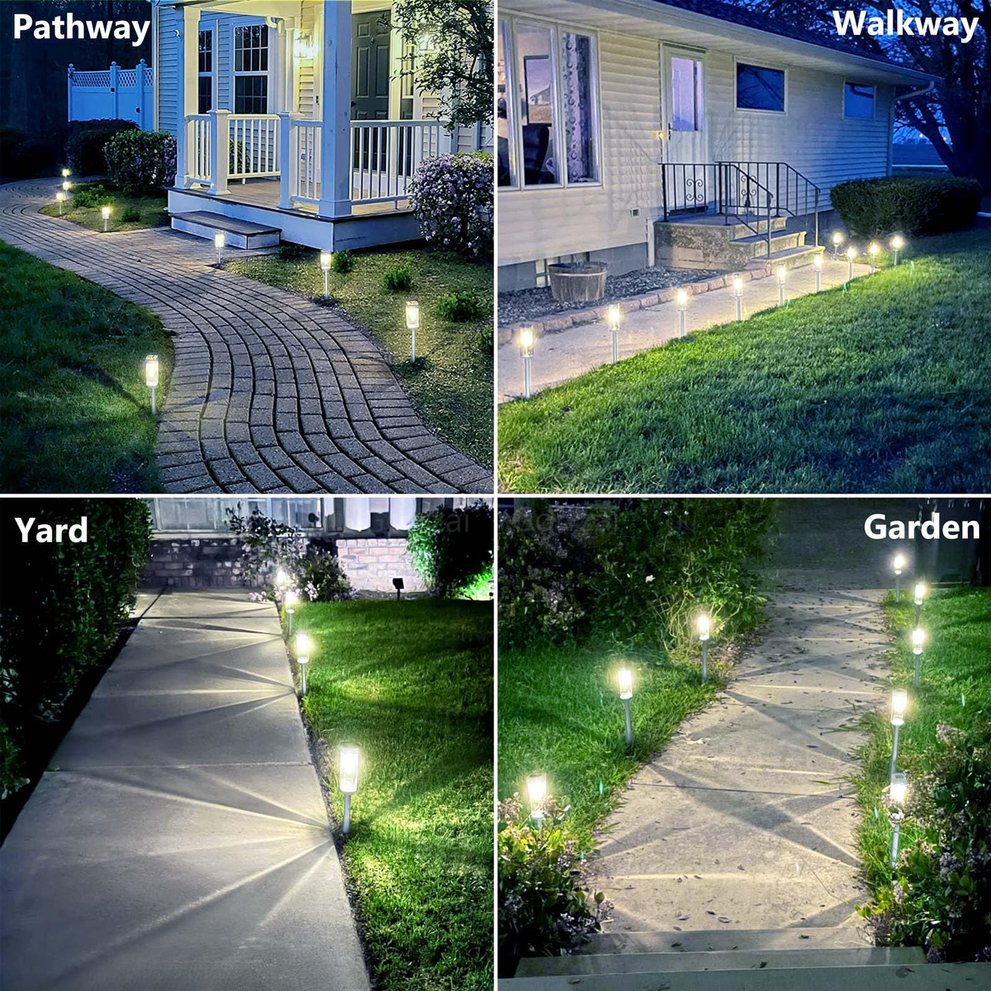 Q: Where can I use these solar pathway lights?A: These solar lights are versatile and can be used for pathways, driveways, lawns, landscapes, walkways, gardens, yards, backyards, and patios.