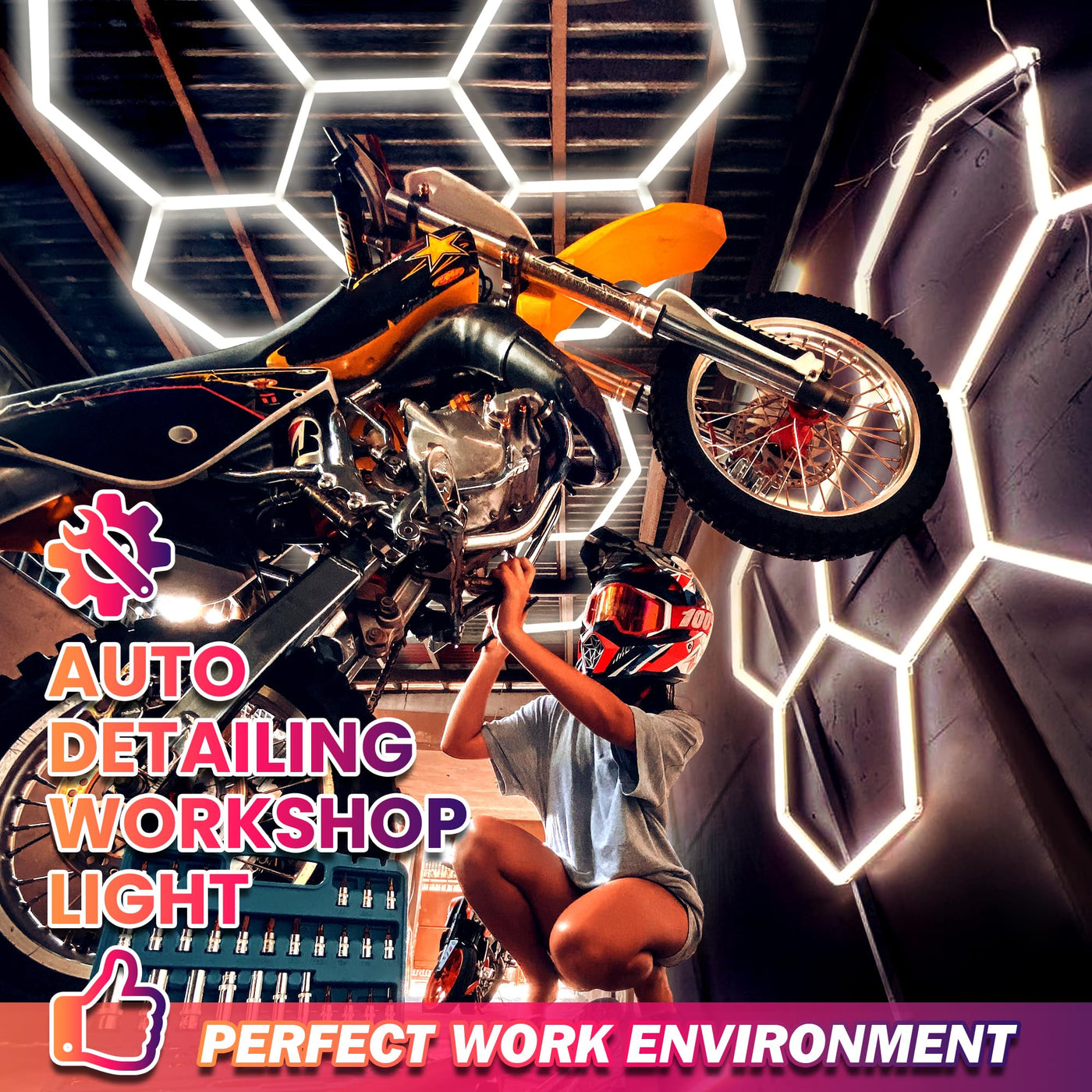 Hexagonal Grid workshop LED light is widely used in Workshop, Garage, Auto Service Center, Auto Detailing Shop, Vinyl Wrap, PPF, Hair Salon, Gym. The Hexagonal Grid LED is a perfect focal piece for any building, space or venue with its brilliant 6500K white light and 110-120lm/w luminous flux rating. The Hexagonal Grid LED comes in a Aluminum frame along side a Polycarbonate Cover which is perfect for long term durability.