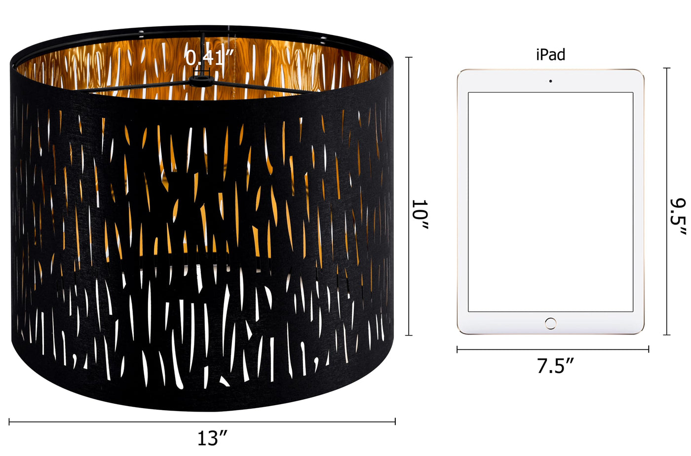 Q: What are the dimensions of the GOSO Black Lamp Shade?A: The GOSO Black Lamp Shade has a top diameter of 13 inches, a bottom diameter of 13 inches, and a height of 10 inches, making it a medium size that fits most table and floor lamps.