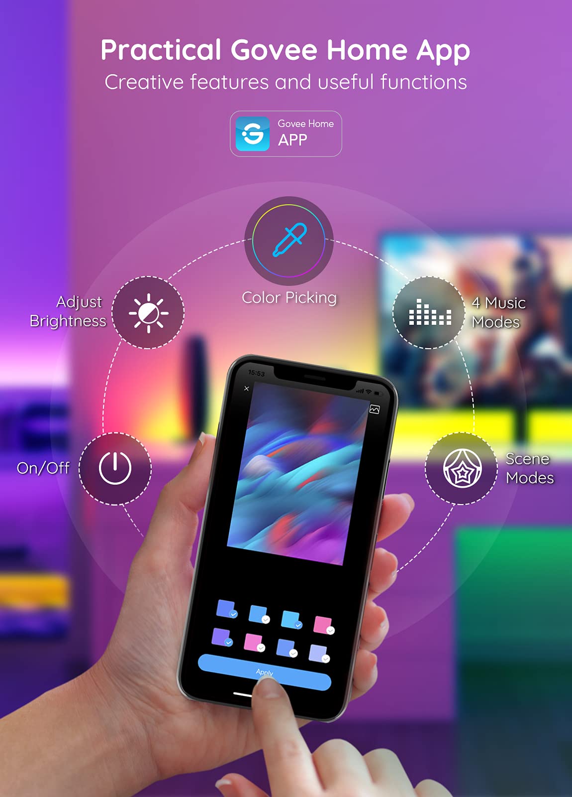 Govee RGBIC LED TV Backlights Create You Wonderful Color Characteristic Govee RGBIC, the light shows multiple colors in one line, allows you to customize each strip light segment Suitable Length, 6.56ft Length LED TV backlights is suitabe for most of computers and TVs App Control, Thanks to bluetooth-enabled feature, Govee Home app allows you control lights at fingertips Music Sync, the brightness and color of the LED lights for TV is sync with your favorite music rhythm Daily Waterproof, updated rubber coating protects it against water splash, make it possible for a wild application Suitable length, the tv lights is suitable for most 30- 50 inch TVs Specification Item Weight: 5.6 ounces Package Dimensions: 7.52 x 5.31 x 0.75 inches Size: 6.56FT Color: Multicolor Style: Modern Shape: Linear Power Source: Corded Electric Voltage: 5 Volts Wattage: 10 watts Note These LED strip lights can not be cut