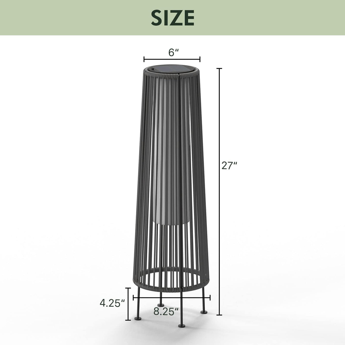 STYLISH DESIGN: Our Gordes floor lamp showcases a modern open weave wicker pattern, providing a unique sculptural element for your outdoor living area. 25 LEDs emit 20 lumens of glowing light, creating a charming and romantic atmosphere for your patio, path, deck, or garden | ALL-WEATHER MATERIALS: Our resin wicker handwoven on the e-coating and powder coated steel frame, combined with IP65 waterproof rated design, providing more durability and extreme resistance to harsh outdoor conditions, such as UV rays, rain, and snow | SOLAR POWERED: With 6-8 hours of charging in direct sunlight, your garden lights will shine for 8-10 hours, turning on automatically at night with a dusk to dawn sensor | ADAPTABLE PLACEMENT: Standing at 27 inches high, this solar lantern can be used as moody atmospheric lighting or dramatic pathway lighting. Also makes a great housewarming gift for family and friends | EASY TO USE: No assembly for the Gordes wicker solar light-- just take it out of the box and put it in place