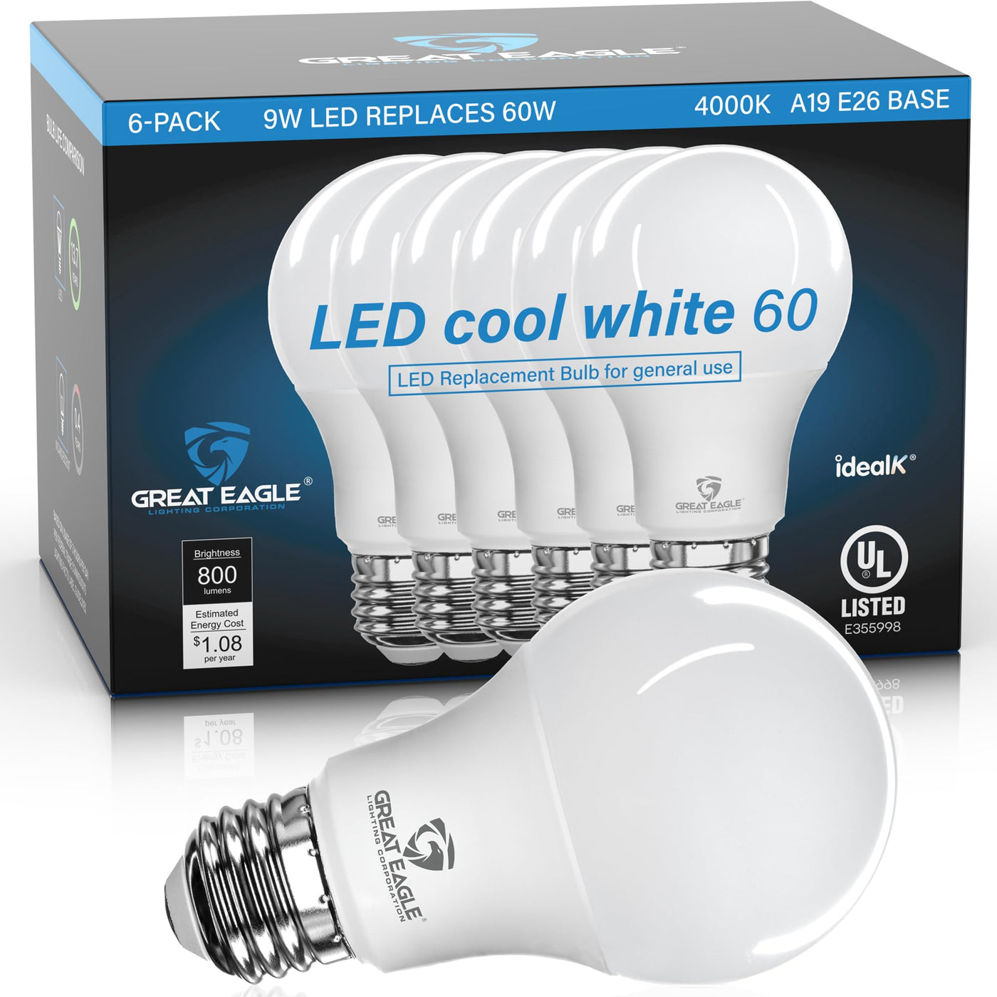 Great Eagle A19 Led Light Bulbs 60 Watt Equivalent - Ul Listed - Cool White 4000K Led Light Bulb - 9W Non Dimmable, 800 Lumens (6 Pack)