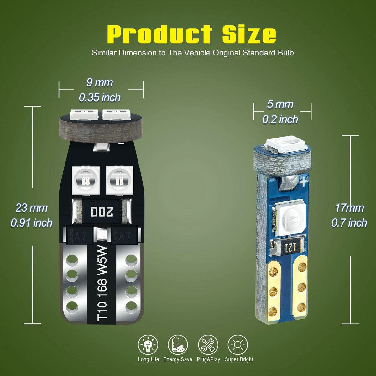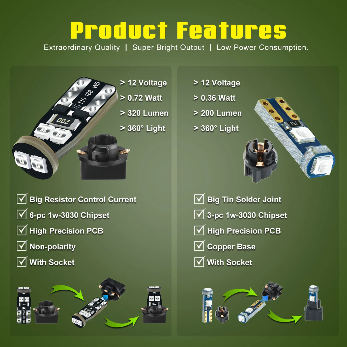 Product specifications: Lighting Output: T10 bulb is about 320 lumen and T5 bulb is about 200 lumen Working Voltage: 9-16V DC Lifespan: 50,000+ working hours Product features: 1.1 watt dual core 3030-SMD chipset 2. 360wide-angle illumination 3. non-polarity, directly replacement without modify 4. Strong shock resistance and low temperature rise 5. Strict quality control, all bulbs have been 100% tested before shipping Fitment: T10 Cross reference part number: 124 147 152 158 159 160 161B 161 168 168A 168NA 175 184 192 193 194 194A 194B 194G 194NA 194NAK 194R 259 280 285 292 447 464 555 558 579 585 655 656 657 906 912 921 1250 1251 1252 2450 2652 2825 2821 2825 2827 2921 3652 W5W W5WB W5WLL PC168 PC175 PC194 PC195 PC160 PC161 PC168B PC194G PC195NA T5 cross reference part number: 17 18 27 37 58 70 73 74 79 85 86 206 207 286 306 307 308 406 407 2721 PC74 PC37 PC118 882 Applications: automotive motorcycle instrument cluster panel light, and clock light, ash tray light, radio dial light, ignition light, dash check light, engine check light, seat belt light, indicator light, gear shifter light, map light, dome light, trunk light, door light, vanity mirror light, glove box light, A/C light etc. as long as your original bulb size are same as above Package include: 10-pc T5 size bulbs 10-pc T5 size sockets 10-pc T10 size bulbs 10-pc T10 size sockets Note: If you have any other problem, please always feel free to contacts us, we would provide satisfactory solution to make your purchase risk free.