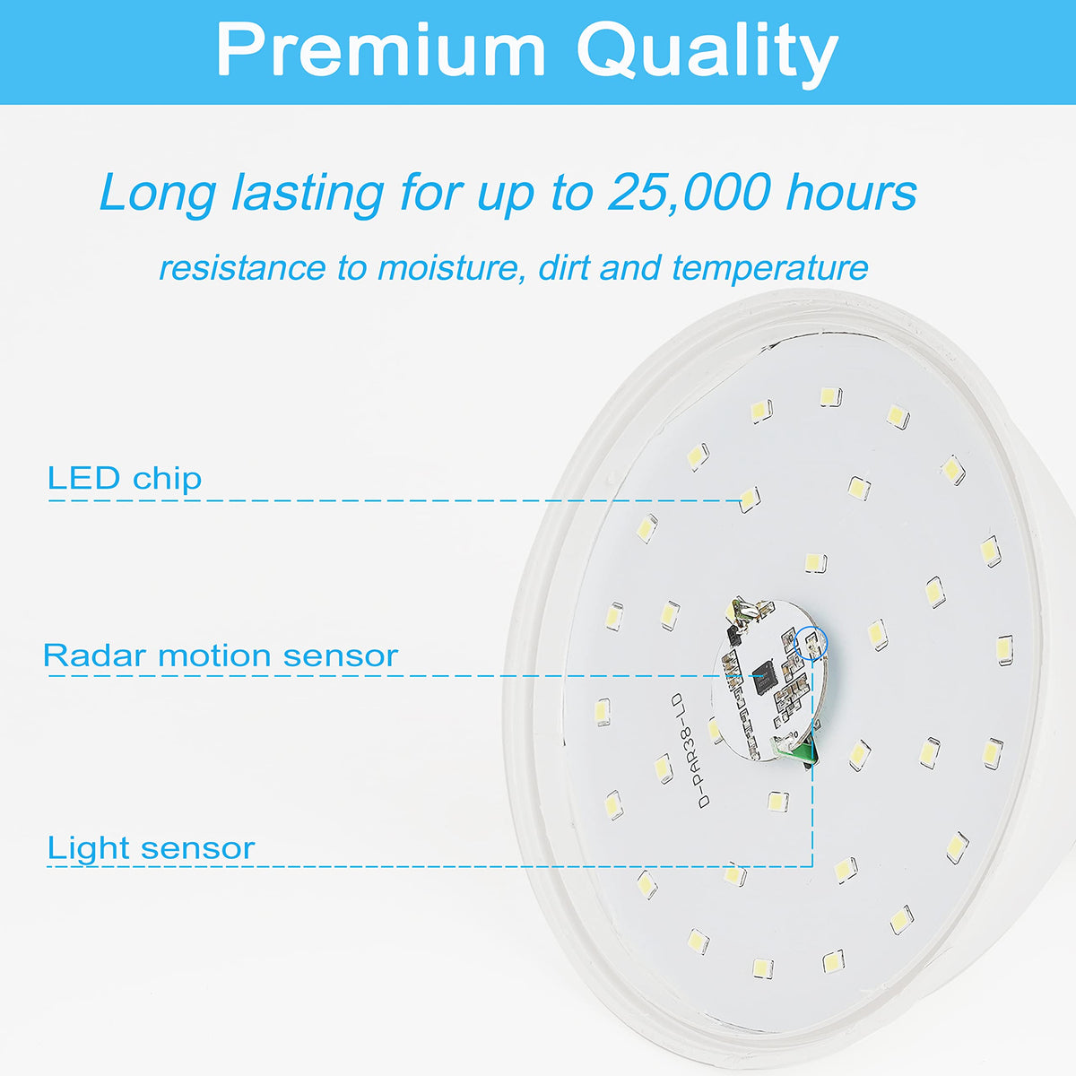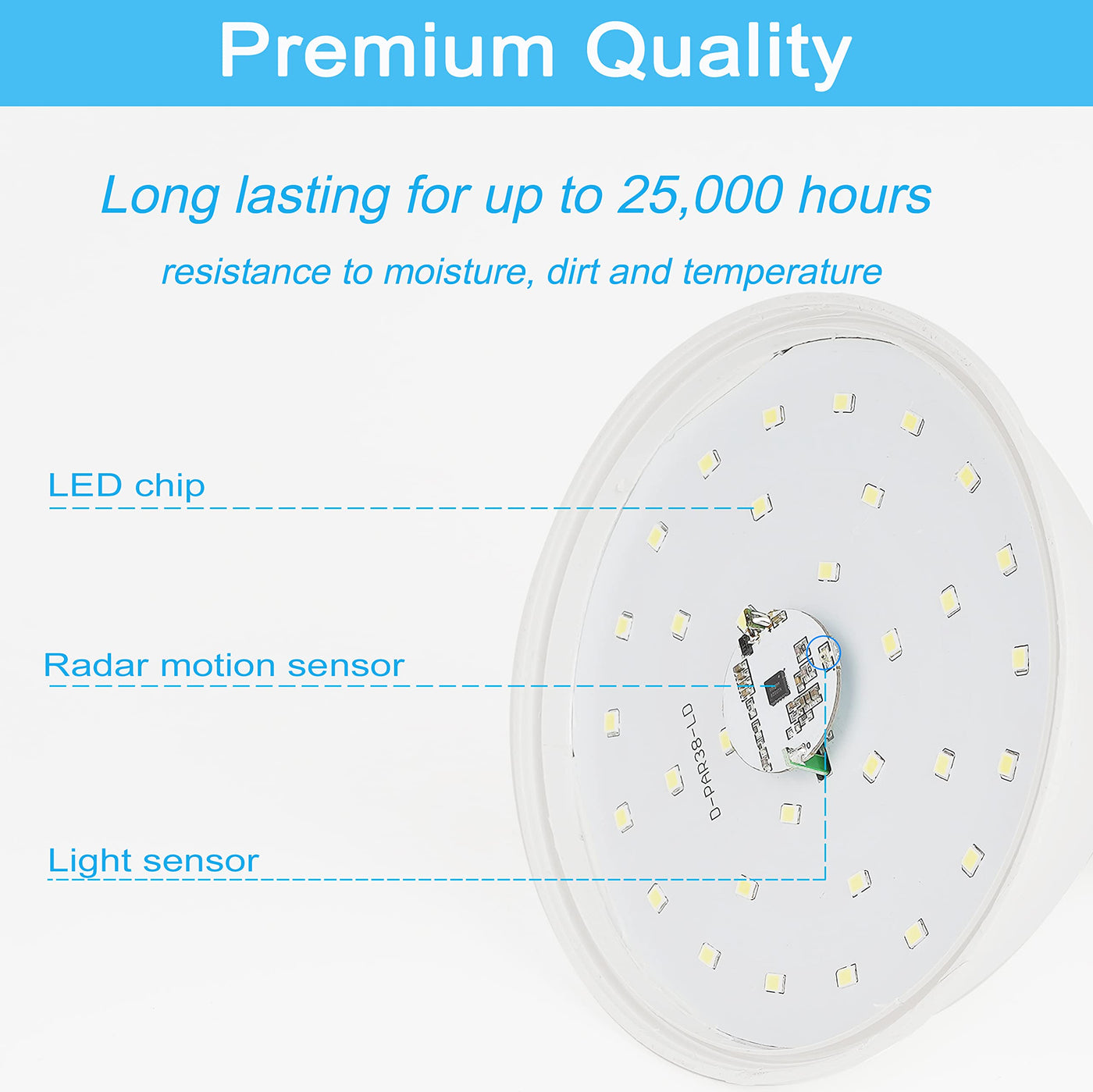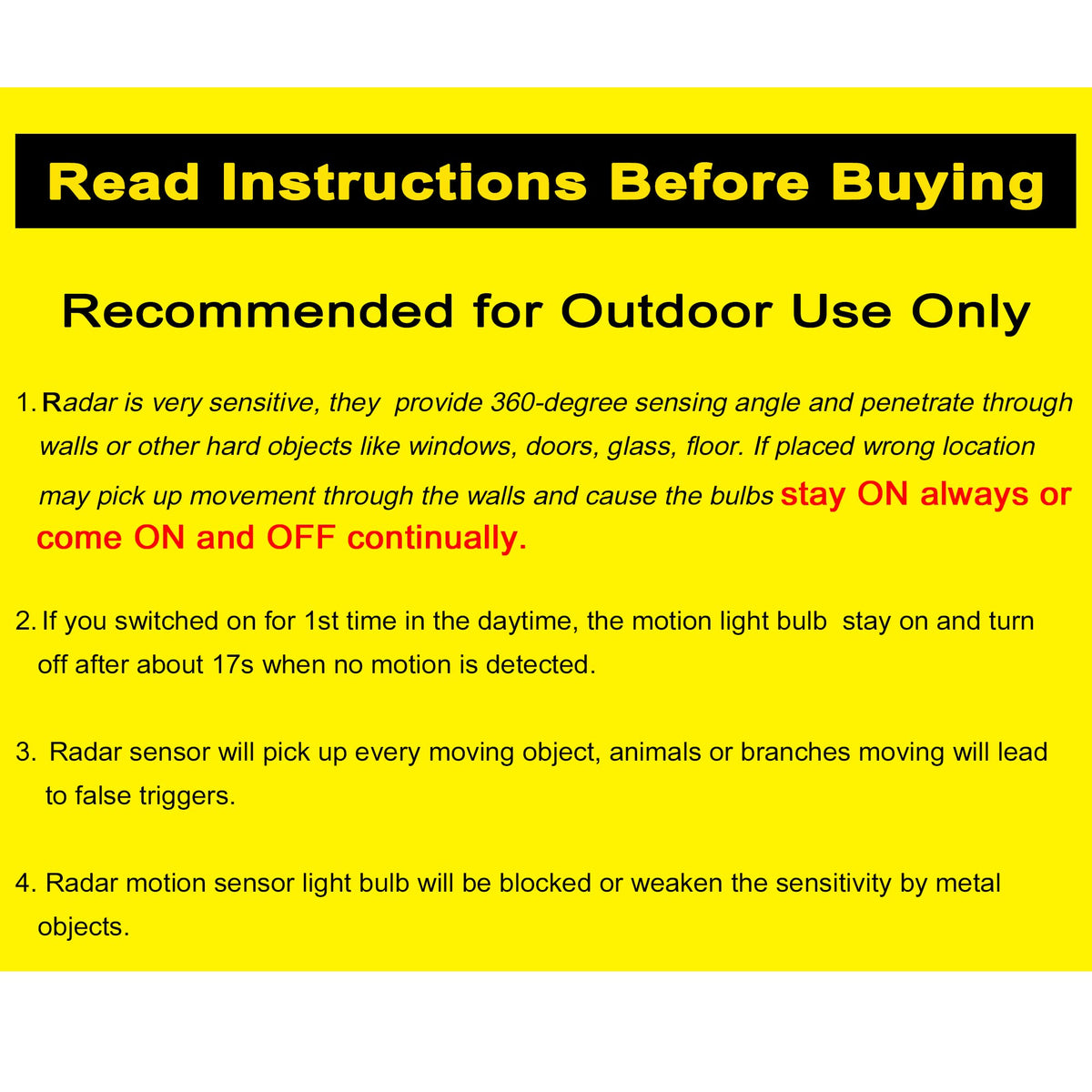 Specification : Wattage: 15W Bulb Base: E26 Shape : Par38 Voltage: 90-265V AC Lifespan: 25,000 hours Detection Angle: 360 Delay Off Time: 17+/-3S Detection Area: 16.4-23ft Detection Height: 13.1-16.4ft Luminous Flux: 1500 Lumen Color Temperature: 5000 Kelvin Note: 1.Motion sensor outdoor light bulbs built-in dusk to dawn sensor and will be affected by other light sources. Pls keep distance from other light bulbs. 2. Radar motion sensor outdoor bulb will be blocked or weaken the sensitivity by metal objects.